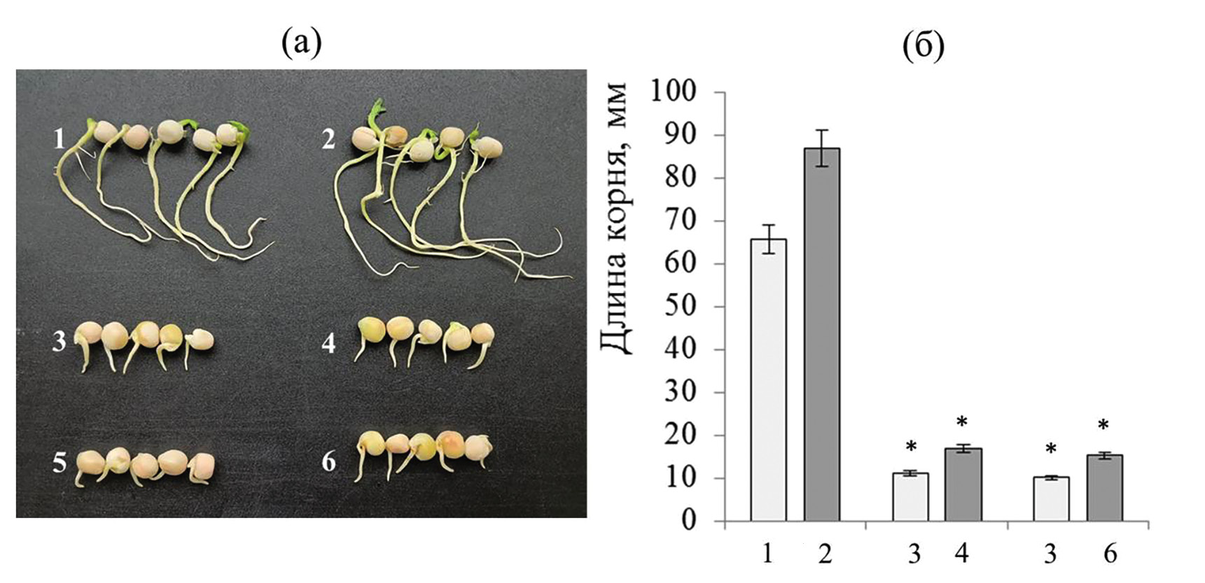 Рис. 5. Растения гороха (а) и длина корней проростков (б) при стрессовом воздействии Pb(CH3COO)2: 1 – необработанные семена; 2 – обработанные штаммом Pseudomonas sp. OBA 2.4.1 семена; 3 – необработанные семена в присутствии 1мМ Pb(CH3COO)2; 4 – обработанные псевдомонадами семена в присутствии 1 мМ Pb(CH3COO)2; 5 – необработанные семена в присутствии 2 мМ Pb(CH3COO)2; 6 – обработанные псевдомонадами семена в присутствии 2 мМ Pb(CH3COO)2.