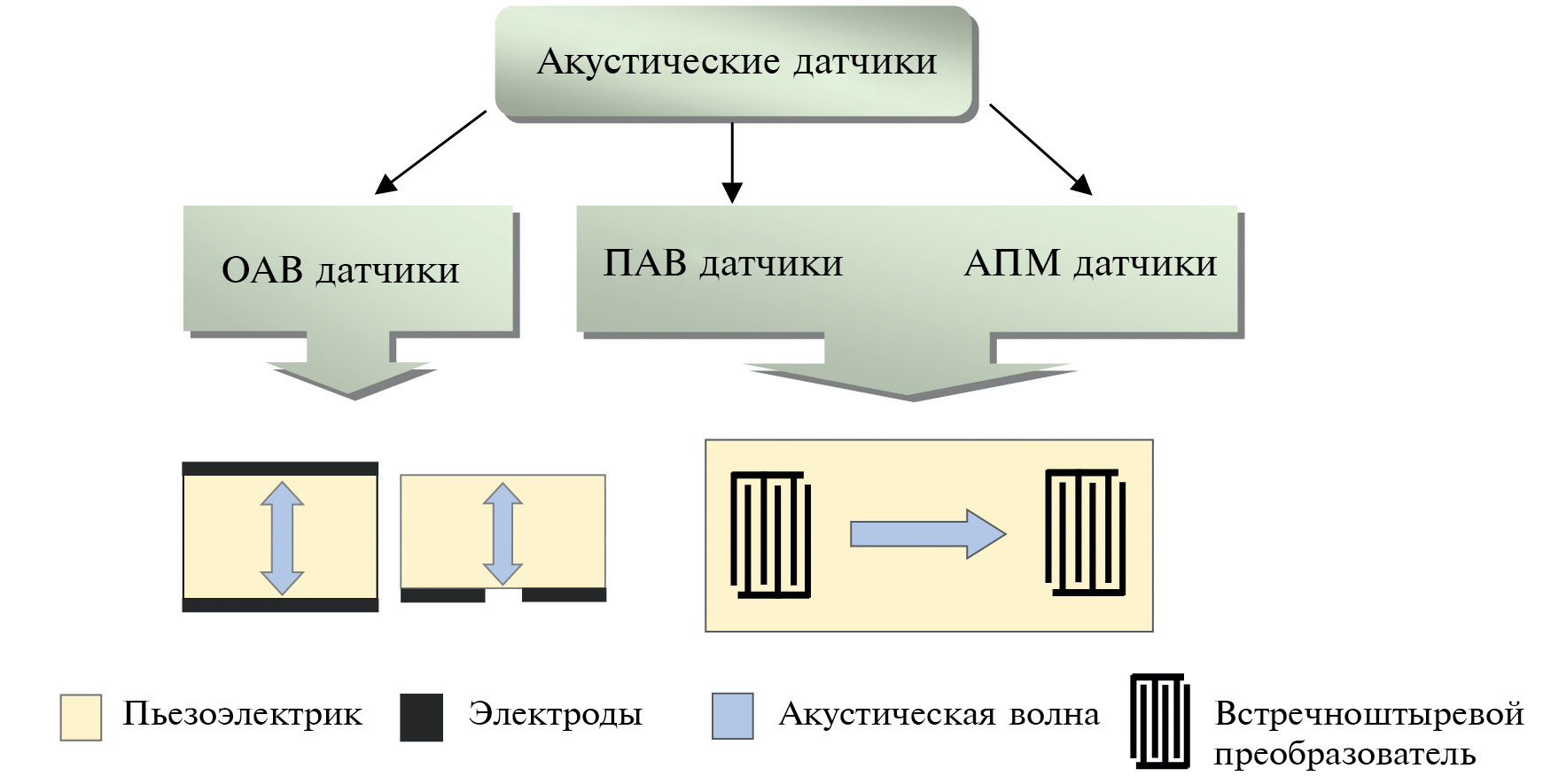 Рис. 3. Классификация акустических датчиков: ОАВ – объемные акустические волны, ПАВ – поверхностные акустические волны; и АПМ – акустические пластинчатые моды [38].