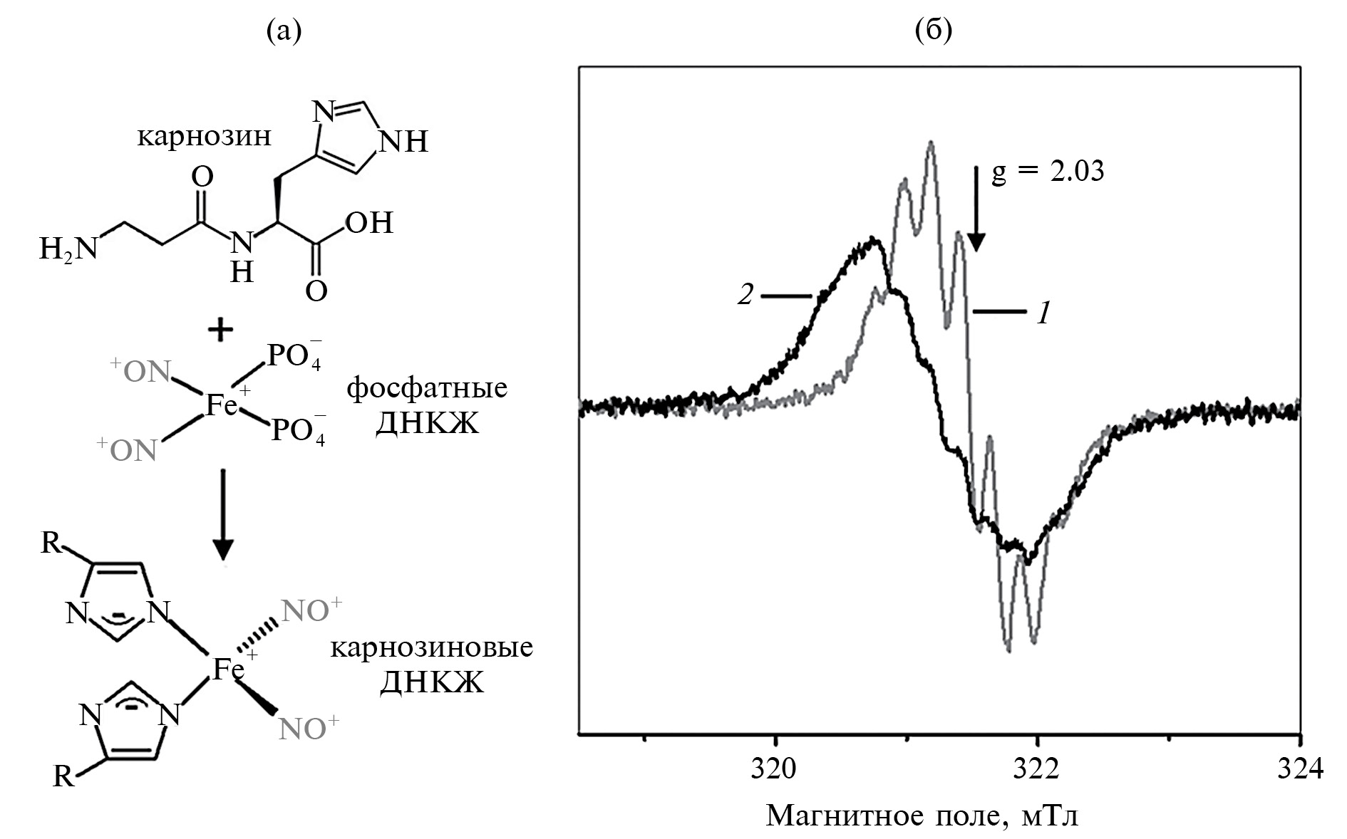 Рис. 1. Превращение ДНКЖ с фосфатными лигандами в карнозиновые ДНКЖ: а – схема образования карнозиновых ДНКЖ при замещении фосфатных лигандов комплексов карнозином; б – спектры ЭПР фосфатных (1) и карнозиновых (2) ДНКЖ.