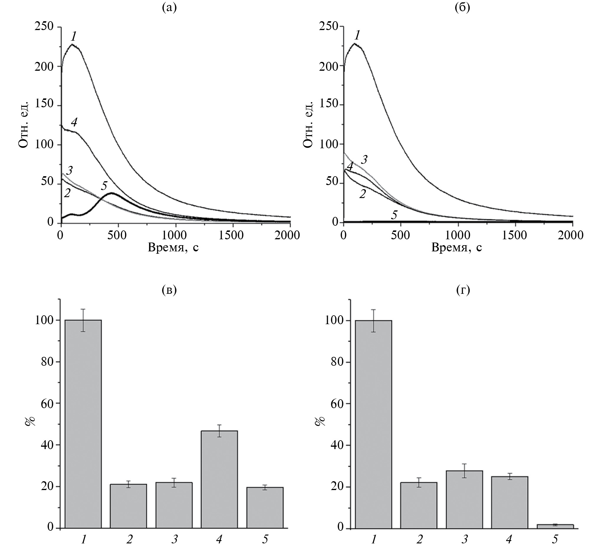 Рис. 2. Влияние карнозина, карнозиновых ДНКЖ и Fe2+ на кинетику (а, б) и светосумму (в, г) люминол-зависимой хемилюминесценции (%). За 100% принята светосумма в контрольном образце. Контроль – реакционная смесь без добавок (1), с добавлением: FeSO4 (2), карнозина (3), карнозина + FeSO4 (4), карнозиновых ДНКЖ (5).