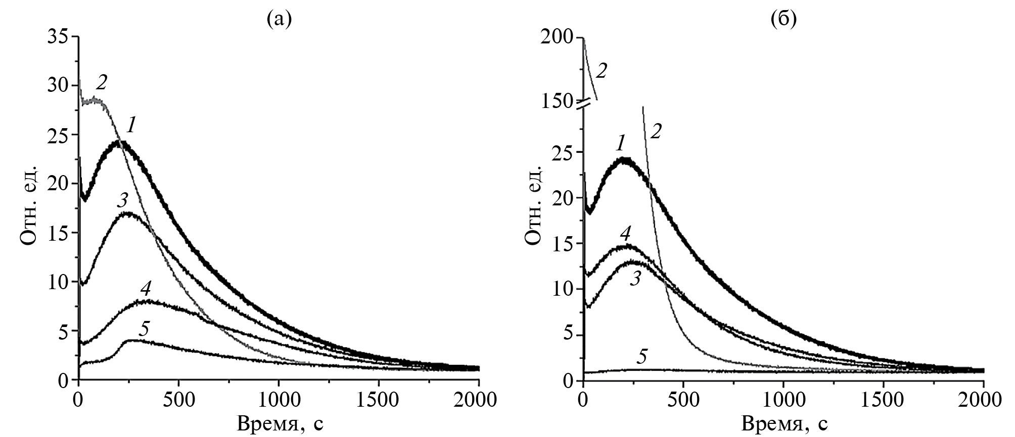 Рис. 3. Влияние карнозина, карнозиновых ДНКЖ и ионов Fe2+ на кинетику люминол-зависимой хемилюминесценции (отн. ед.) в системе гемин ― t-BOOH при различных концентрациях связанного в комплексах карнозина 0.1 (а) или 1 мМ (б). 1 – контроль, реакционная смесь без добавок; 2 – (1) + FeSO4; 3 – (1) + карнозин; 4 – (1) + карнозин+ + FeSO4; 5 – (1) + карнозиновые ДНКЖ.
