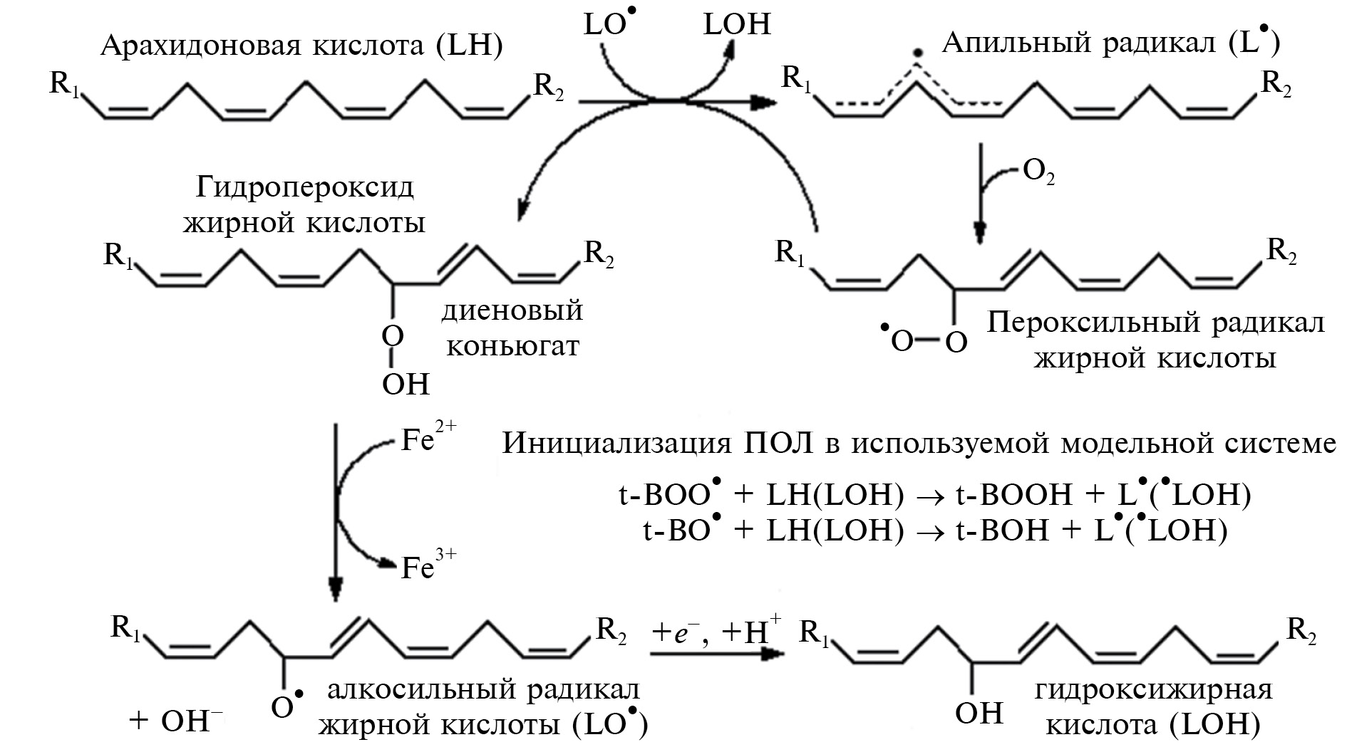 В этих реакциях продуцируются такие прооксиданты, как свободные радикалы − производные t-BOOH (t-BO•, t-BOO•), а также перферрильная (•+порфирин-Fe(IV)=O) и оксоферрильная (порфирин-Fe(IV)=O) формы гемовой группы.