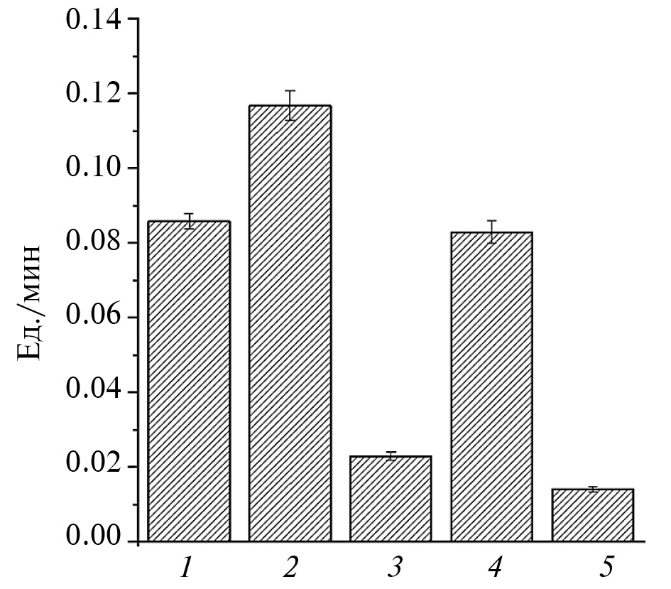 Рис. 6. Начальная скорость образования диеновых конъюгатов (ед./мин) в ходе окисления арахидоновой кислоты в системе metMb ― t-BOOH. Контроль, реакционная смесь без добавок (1), с добавлением: FeSO4 (2), карнозина (3), карнозина + FeSO4 (4), карнозиновых ДНКЖ (5).