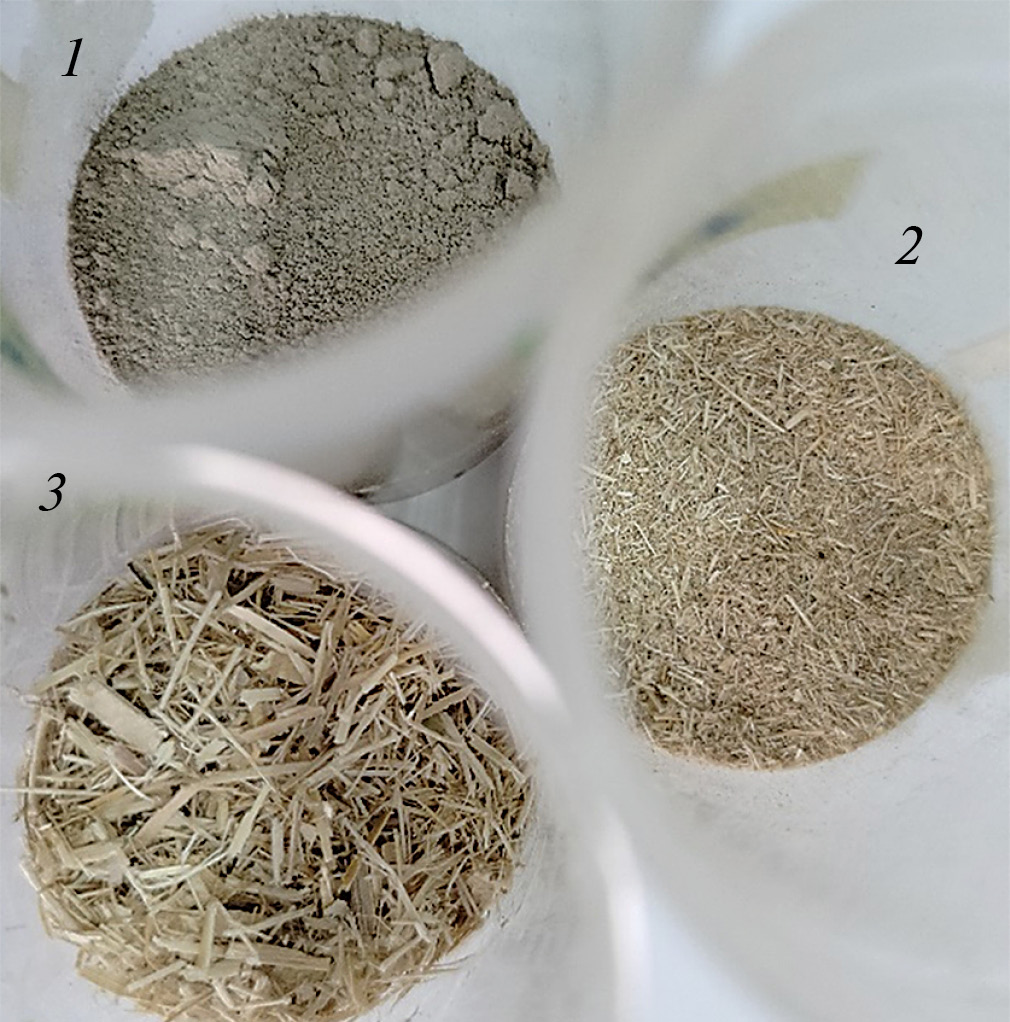 Рис. 1. Тростник с разной степенью измельчения на ножевой мельнице: 1 – пылевая фракция, 2 – грубая фракция, 3 – исходный тростник.