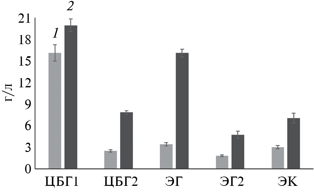 Рис. 3. Концентрация ВС после 48 ч гидролиза тростника (40 г/л), предобработанного ГЭР ХХл с МК (1) или МЭА (2), под действием очищенных ферментов (10 мг белка/г субстрата) с добавлением β-глюкозидазы (1 мг белка/г субстрата) при 50°С, рН 5.0: ЦБГ – целлобиогидролаза, ЭГ – эндоглюканаза, ЭК – эндоксиланаза.