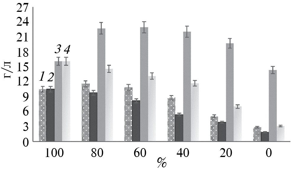 Рис. 4. Концентрация ВС после 48 ч гидролиза тростника (40 г/л), предобработанного ГЭР ХХл с МК (1, 2) или МЭА (3, 4), под действием смесей очищенных ферментов (4.5 мг общего белка/г субстрата) с добавлением β-глюкозидазы (0.45 мг белка/г субстрата) при 50°С, рН 5.0: 1 и 3 – смеси ЦБГ с ЭГ; 1, 2 и 4 – с ЭК. На оси абсцисс указано процентное содержание целлобиогидролаз в смесях относительно общего содержания ферментов.
