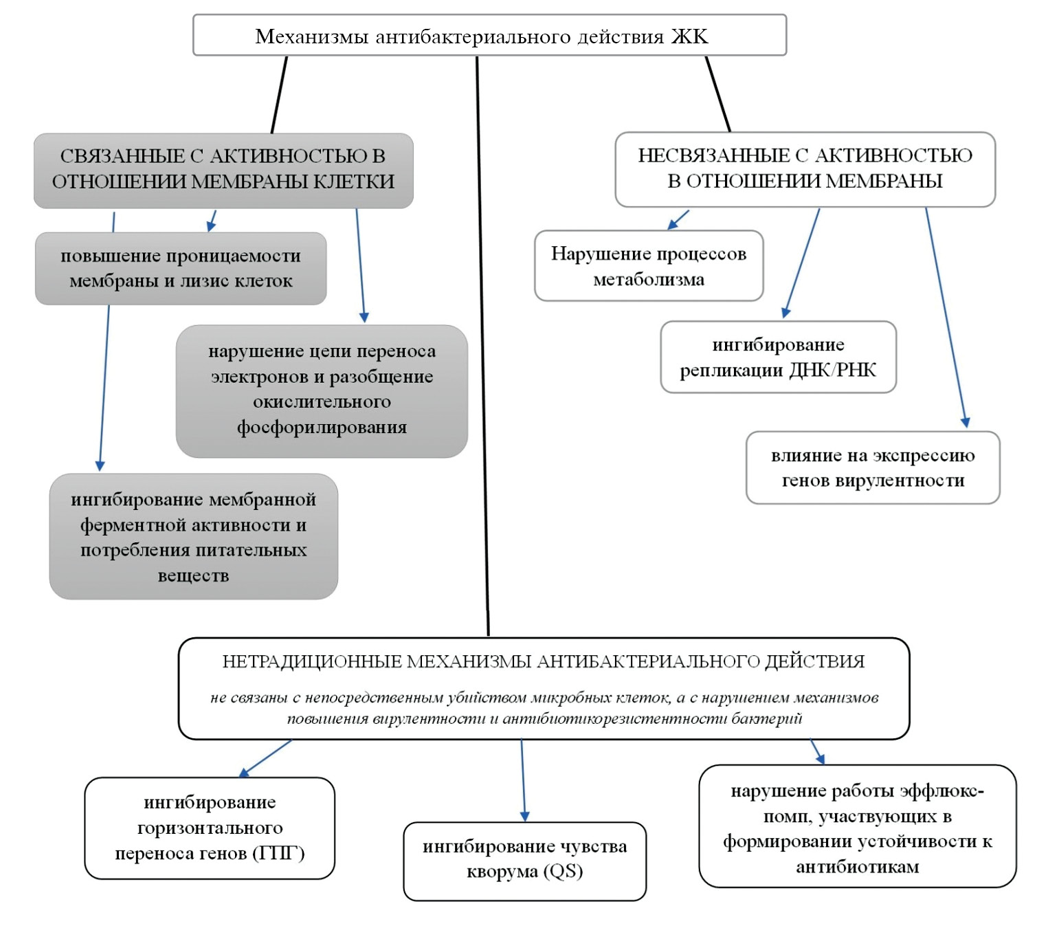 В настоящее время выделяют нетрадиционные механизмы действия ЖК, сущность которых связана не с непосредственным лизисом микробных клеток, а с нарушением механизмов повышения вирулентности и антибиотикорезистентности бактерий. К таким механизмам относятся ингибирование горизонтального переноса генов (ГПГ), ингибирование чувства кворума (QS) и нарушение работы эффлюкс-помп, участвующих в формировании устойчивости к антибиотикам [23].