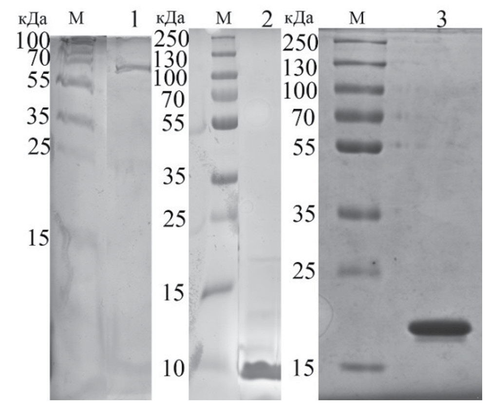 Рис. 1. Результаты ПААГ-электрофореза в денатурирующих условиях образцов выделенных рекомбинантных белков TdT (дорожка 1), Sso7d (дорожка 2) и EcSSB (дорожка 3); М – стандарт молекулярных масс белков 10–250 кДа.
