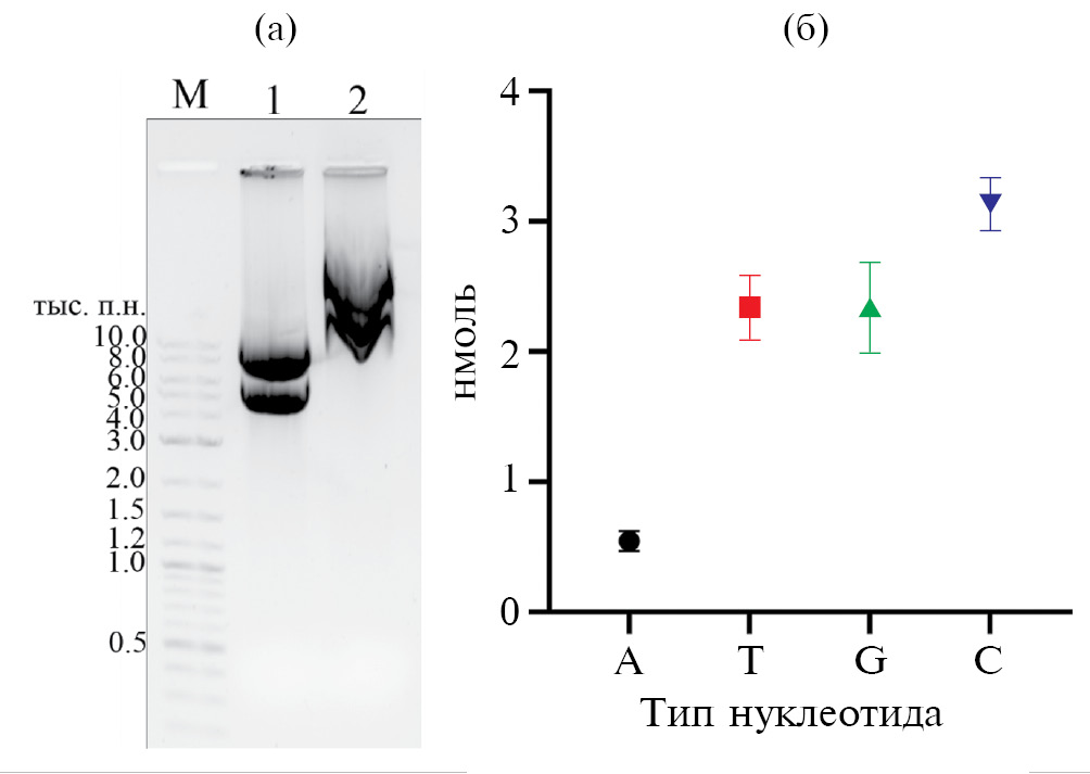 Рис. 2. Результаты электрофореза кольцевой плазмидной ДНК (5994 п.о.) в 1% агарозном геле без Sso7d (дорожка 1), в присутствии Sso7d (дорожка 2). М – стандарт линейной ДНК (а); количество гомополимерных 15-мерных олигонуклеотидов различной природы (нмоль), связавшихся с EcSSB (10 нмоль), иммобилизованном на Ni2+-NTA-агарозе (б).