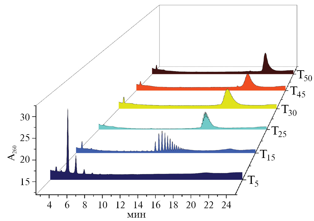 Объем вводимой пробы – 5 мкл. Для формирования градиента использовали бинарный насос и следующий режим элюирования: 35% фазы Б к объему элюэнта в течение 2 мин, от 35 до 65% – 19 мин и 65% в течение 9 мин. Скорость потока подвижной фазы 200 мкл/мин, температура колонки 40°С. Субстрат и продукты реакции детектировали при длине волны 260 нм. Анализ хроматограмм проводили в программе MassHunter V 11.0 (“Agilent”, США). В описанных условиях время удерживания (tR) олигонуклеотидов составляло: Т5 5.6 мин; Т15 12.4 мин; Т25 15.2 мин; Т30 16.5 мин; Т45 18.1 мин; Т50 22.2 мин.