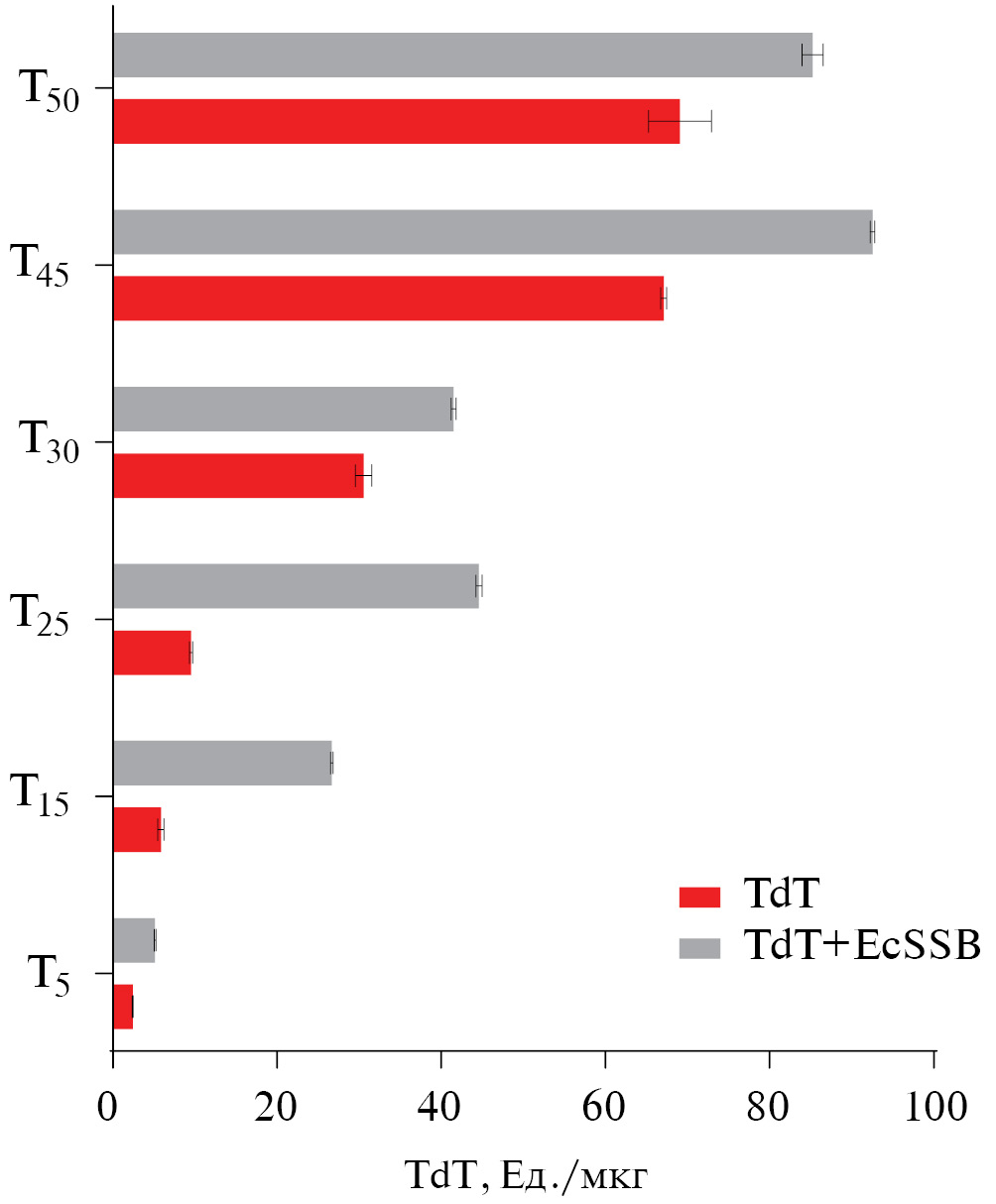 Влияние белка EcSSB на активность TdT при разной длине исходного олигонуклеотидного субстрата. Для всех исследованных олигонуклеотидных субстратов (T5–T50) добавление в реакционную смесь белка EcSSB приводила к повышению активности TdT (рис. 8, табл. Д2). Наиболее значительный эффект наблюдался для 15- и 25-звенных олигонуклеотидных субстратов.