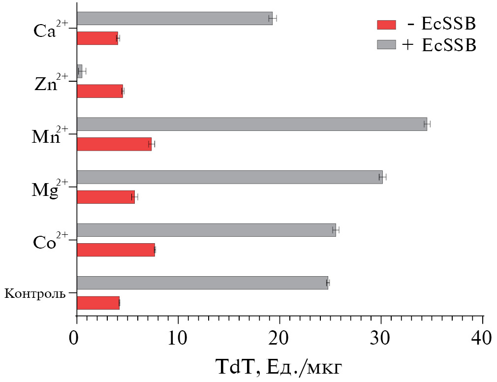 Влияние белка EcSSB на ферментативную активность TdT в присутствии катионов двухвалентных металлов. Известно, что катионы Me2+ влияют не только на активность TdT, но и на прочность комплекса EcSSB-оцДНК, который зависит от радиуса катионов металла, с увеличением которого снижается необходимая концентрация соли для эффективного связывания ДНК [11].