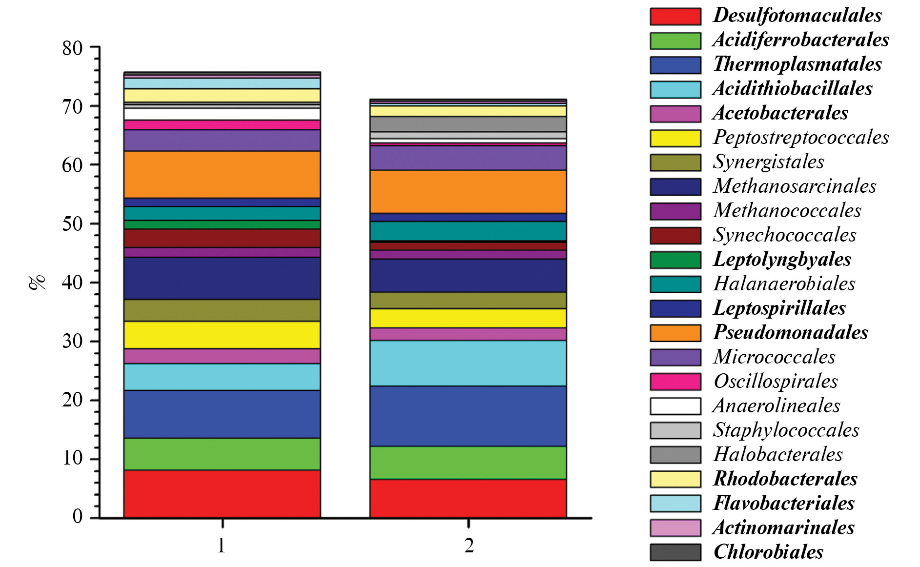 Рис. 1. Распределение ключевых групп микроорганизмов (в % от всех прочтений последовательностей гена 16S рРНК) на уровне порядков в обрастаниях титановых пластин, экспонировавшихся в прибрежной зоне Черного (1) и Белого (2) морей. Жирным шрифтом выделены группы, включающие коррозионно-активные микроорганизмы.