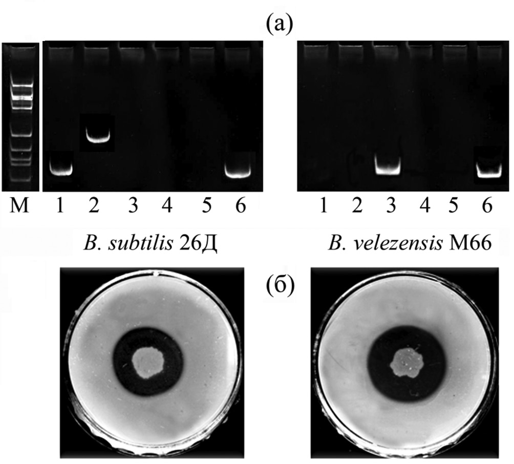 Рис. 2. Антагонистические свойства B. subtilis 26Д и B. velezensis M66 против патогенов. (а) – фотография полиакриламидного геля после разделения продуктов ПЦР последовательностей ДНК бактерий с праймерами к генам, кодирующими ферменты биосинтеза липопептидов: 1 – фосфопантетеинил трансфераза; 2 – сурфактин синтаза; 3 – итуринсинтаза А; 4 – итуринсинтаза В; 5 – фенгицинсинтаза; 6 – ген домашнего хозяйства 16S рРНК; (б) – рост колоний B. subtilis 26Д и B. velezensis M66 на 3%-ном обезжиренном молочном агаре.