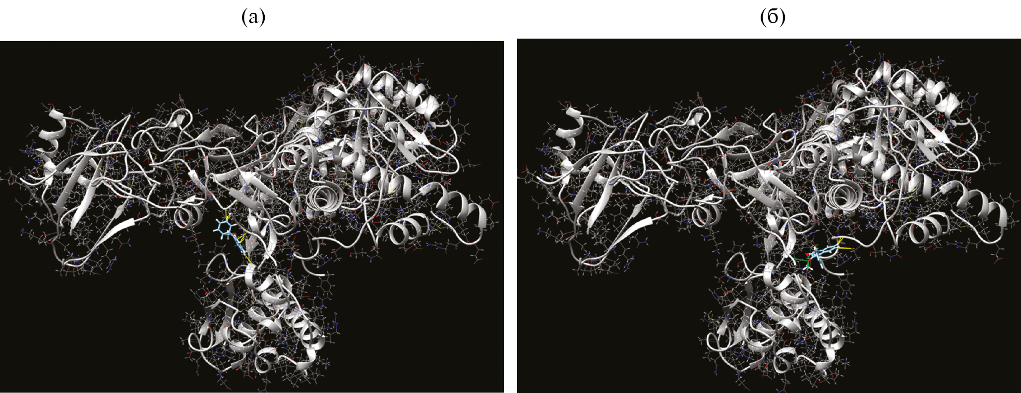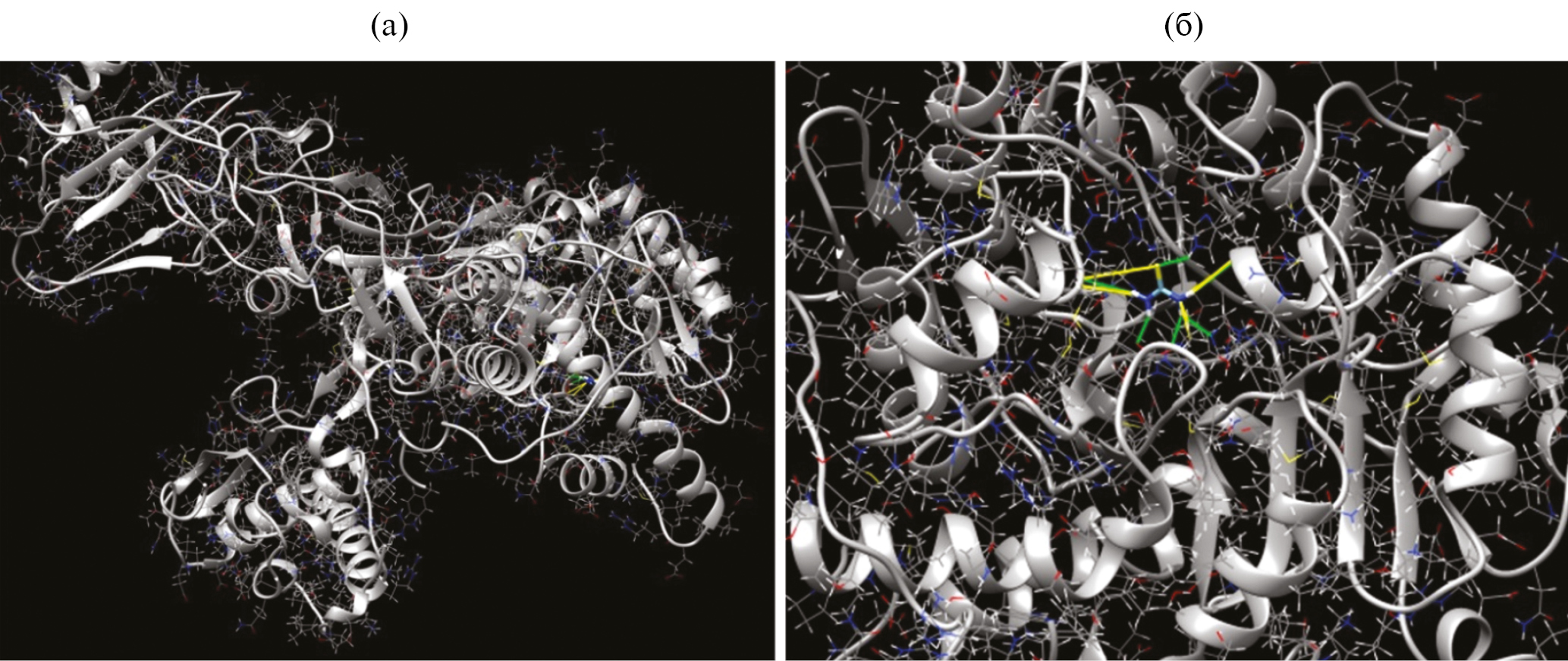 Рис. 4. Рассчитанный комплекс уреазы (PDB ID 4H9M) и 3-O-метилвиридикатина (1). Зелеными обозначены водородные связи: (а) комплекс 3-О-метилвиридикатина с аминокислотными остатками β домена уреазы (ΔG = = –6.924 ккал/моль), (б) комплекс 3-О-метилвиридикатина, расположенный между N-концевым αβ и C-концевым (αβ)8 TIM доменами (ΔG = –6.559 ккал/моль).