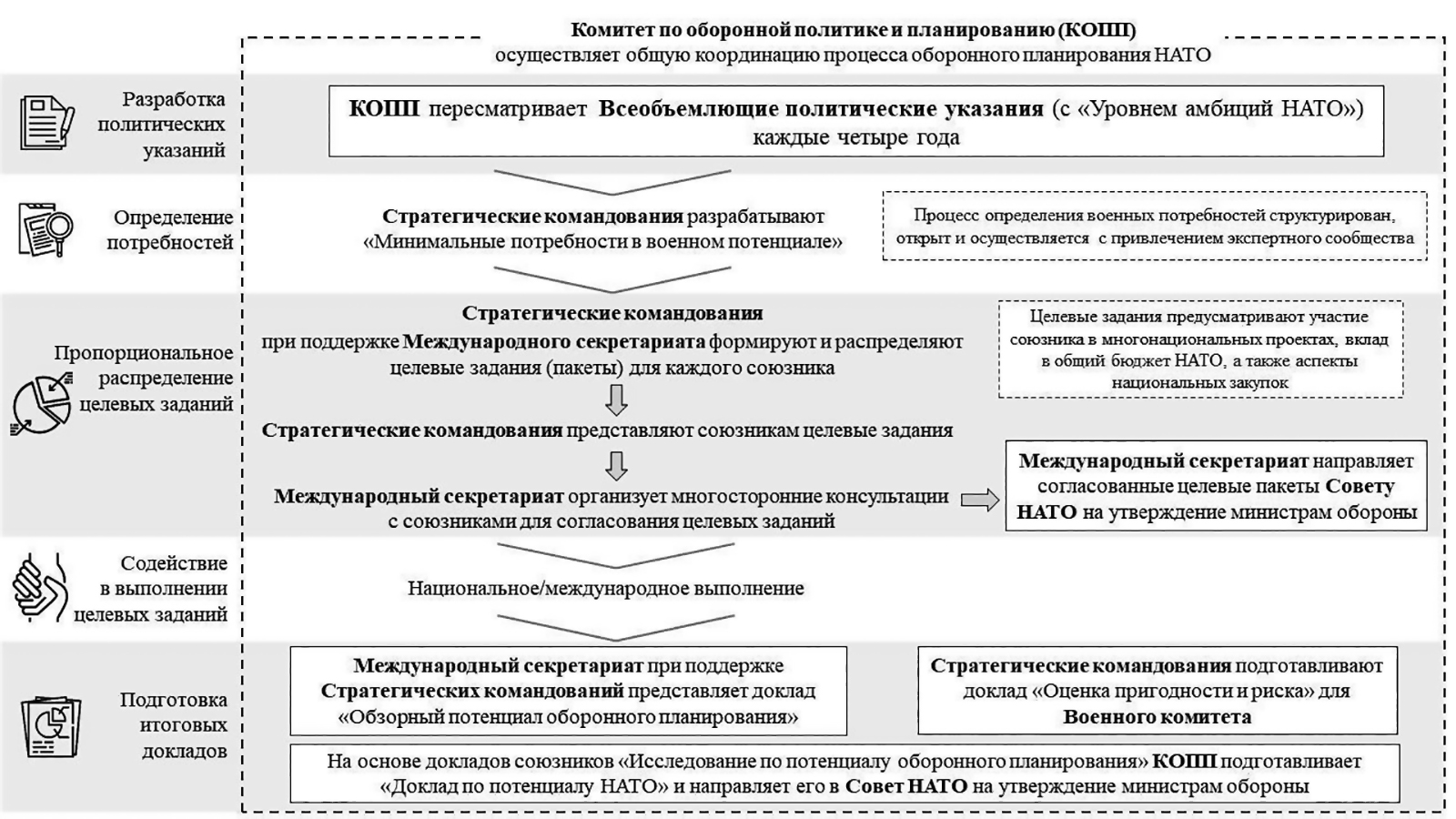 Раньше этап определения потребностей и распределения заданий занимал примерно два года. Так, в октябре 2021 г., спустя два года после редакции «политических указаний» в 2019 г., Генеральный секретарь НАТО Й. Столтенберг объявил о принятии всеми государствами-членами своих новых целевых пакетов36. Теперь, ввиду срочной необходимости укрепления военного потенциала для противодействия «российской угрозе», Стратегические командования намерены согласовать новые целевые пакеты со всеми союзниками уже в 2024 г., таким образом заметно ускорив данный этап оборонного планирования37. После согласования целевые пакеты по каждому государству-участнику утверждает Совет НАТО в составе министров обороны.