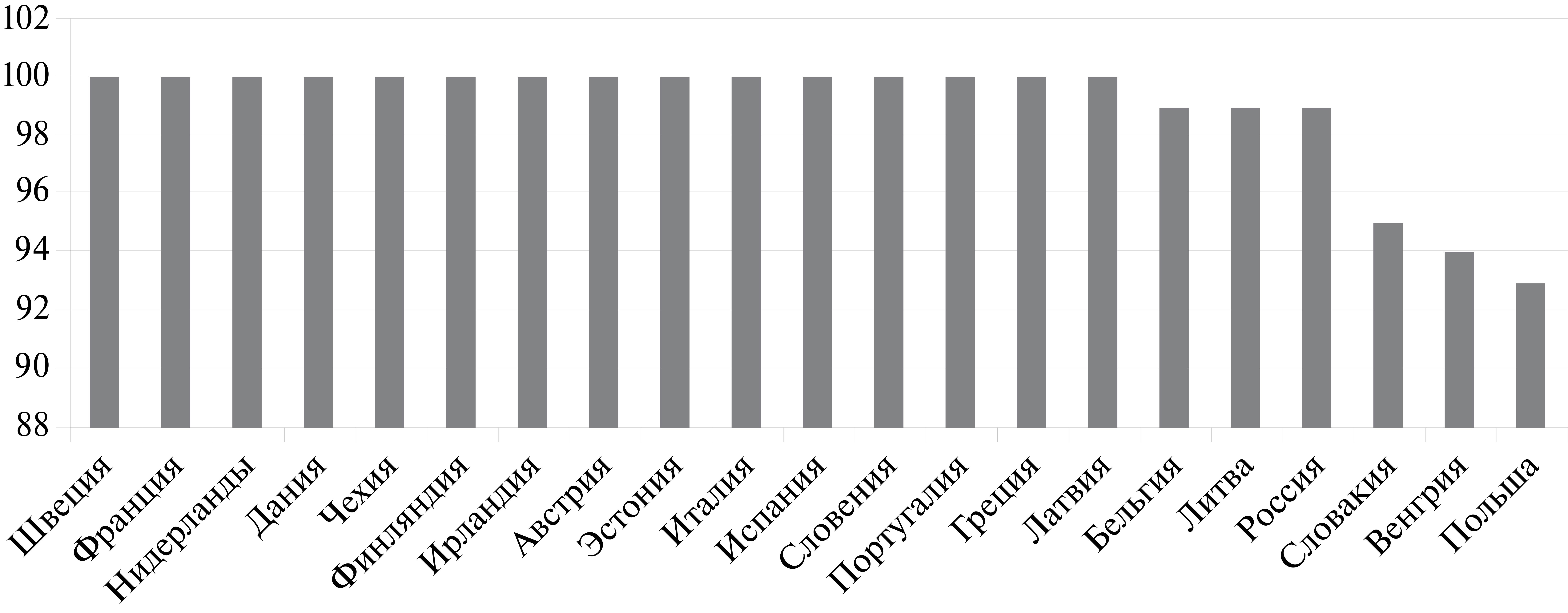 В странах Евросоюза полный охват населения основными услугами (100%) наблюдается в большинстве государств. Только в Словакии, Венгрии и Польше 5–8% населения не покрыты государственной системой здравоохранения (см. рис. 1).