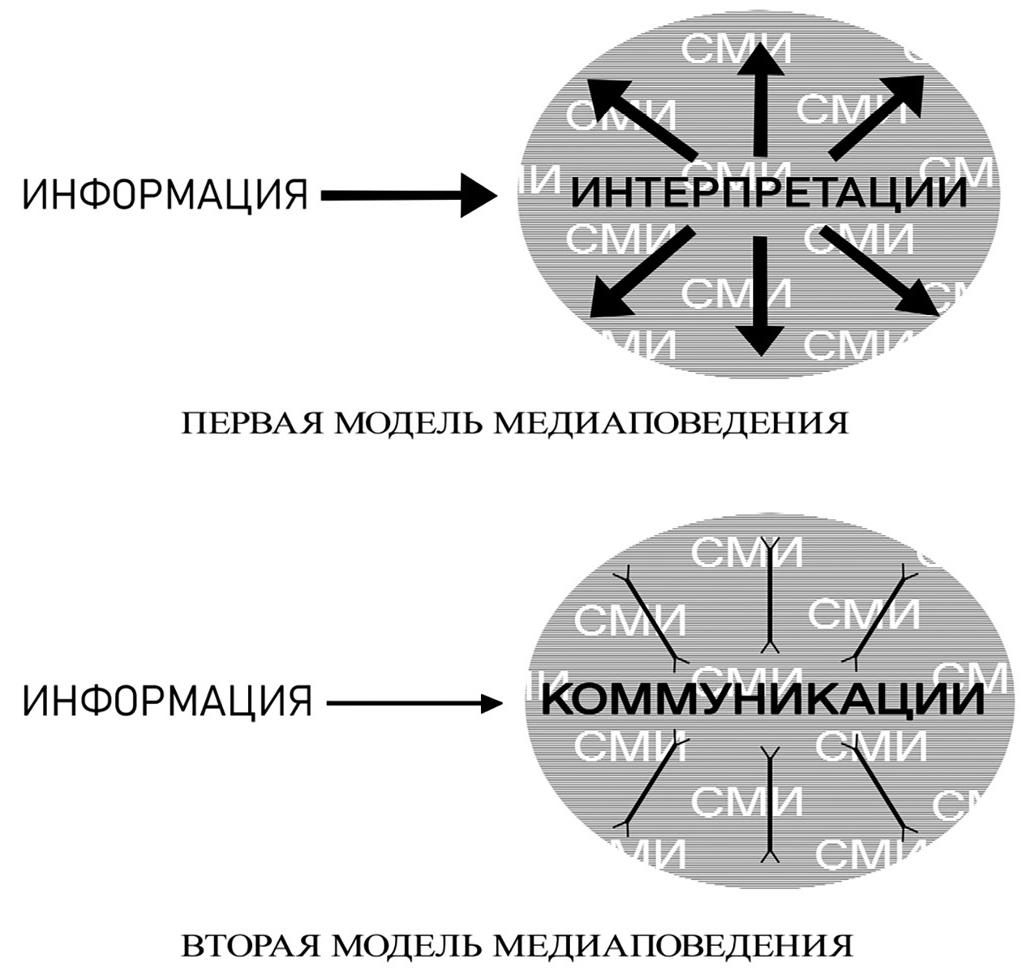 Первая модель медиаповедения показывает, что информация, поступающая в некое сообщество, порождает в нем свои множественные и разнонаправленные интерпретации. СМИ в этой ситуации выступают в качестве регулятора и модератора таких интерпретаций и тем самым обеспечивают собственный монополизм в медиапространстве. Данный порядок философы и подвергали критике. Подобное медиаповедение соответствует невысокому уровню медиаграмотности.
