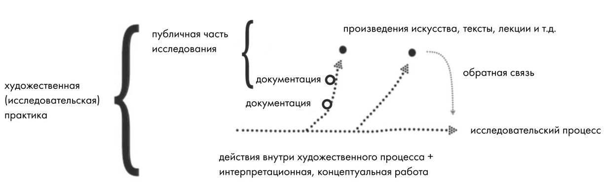 Художественное исследование = художественный процесс (действия внутри практики) + контекстуальная, интерпретационная, концептуальная работа (аргументация точки зрения)21.