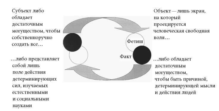 Однако этот путь — не единственный, потому как вполне можно избежать жестокого обращения с объектами, которое я называю критическим варварством. Критический варвар настолько силен, потому что два механизма, действие которых я только что обрисовал, никогда не демонстрируются на одной схеме (рис. 4). Антифетишисты разоблачают объекты, в которые они не верят, демонстрируя продуктивные и проективные человеческие наклонности; затем, без всякой связи с предыдущим, они используют объекты, в которые они верят, для механицистского или каузального объяснения и разоблачения мыслительных способностей людей, чье поведение они не одобряют. Этот довольно безыскусный трюк, благодаря которому возможна подобная критика, хотя мы никогда не понесем в этот убогий ломбард свои ценности, заключается в отсутствии пересечения между двумя совокупностями объектов — находящихся в позиции факта и в позиции фантазии. Вот почему можно одновременно быть, не чувствуя никакого противоречия, 1) антифетишистом в отношении всего, во что вы не верите (в основном в отношении религии, поп-культуры, искусства, политики и т. п.); 2) нераскаявшимся позитивистом в отношении всех дисциплин, в которые вы продолжаете верить: социологии, экономики, теории заговора, генетики, эволюционной психологии, семиотики — выберите ваше излюбленное поле исследований; и 3) абсолютно здоровым и непреклонным реалистом в отношении того, что вам действительно дорого — и, разумеется, это может быть критицизм как таковой, равно как и живопись, наблюдение за птицами, Шекспир, бабуины, протеины и т. п.