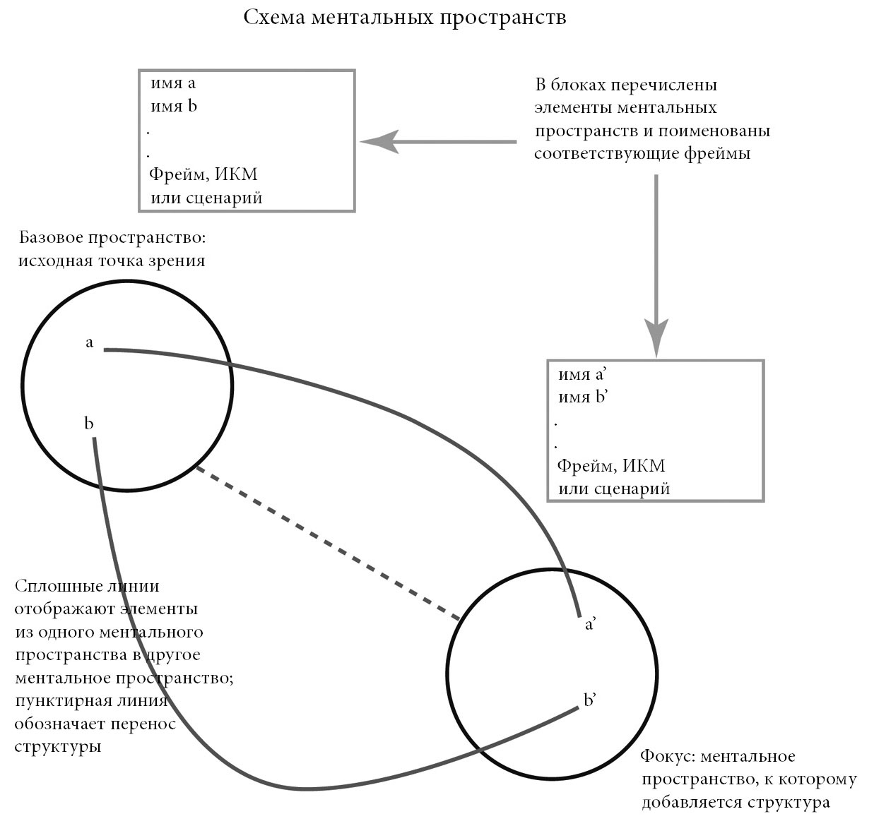Ядром когнитивной лингвистики является то, что ее разработчики называют ментальными пространствами. Ментальные пространства, говорит Фоконье, это «частичные структуры, которые разрастаются, когда мы мыслим и говорим». Так как эти конструкции принадлежат когнитивному уровню, это частичные когнитивные структуры. Это отличает их от структур языка. Подобная когнитивная структура «не является формой, лежащей в основании». Она не «репрезентация» языка или языкового значения и не связана биективно (взаимо-однозначно) ни с каким конкретным множеством лингвистических выражений. Не является эта когнитивная структура и репрезентацией мира. Но она связывает язык с миром, обеспечивая «умозаключения о реальном мире и паттерны поведения». Фоконье и Марк Тёрнер характеризуют эти ментальные пространства как «небольшие концептуальные пакеты, конструируемые по мере того, как мы говорим и мыслим, с целью конкретного понимания и действия». Эти небольшие концептуальные пакеты (или частичные когнитивные структуры), уточняют Фоконье и Тёрнер, «соответствуют активируемым группам нейронов, которые соединены или подсоединяются к другим активированным группам нейронов»22. Когнитивные лингвисты думают об этих нейронных связях как об отображениях (mappings). Например, конфигурация слов, которую вы прочитываете прямо сейчас, открывает в вашем мозге мыслительные пространства, то есть активирует группы нейронов, которые связываются с другими мыслительными пространствами — проецируются, отображаются на них — в процессе конструирования значения.