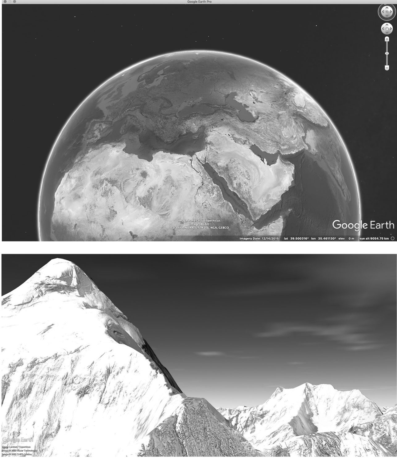 Рис. 1а, б. Сверху вниз: а) Интерфейс программы Google Earth с глобальным видом планеты. б) Вид вершины К2 (Гималаи) в Google Earth. Источник: https://earth.google.com/.