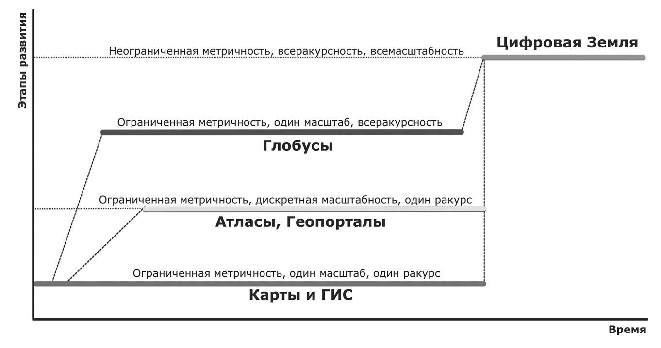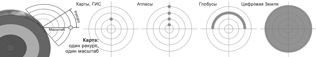 Принципиальное различие между этими четырьмя классами можно наглядно продемонстрировать с помощью диаграмм «ракурс-дальность». Такая диаграмма (рис. 2) показывает множество возможных позиций просмотра определенной точки на поверхности Земли в зависимости от ракурса просмотра и от удаленности от нее для различных типов геовизуализаций. Так, для любой карты возможна только одна позиция — точка, представляющая строго определенный масштаб и строго определенную проекцию. Для атласа — это набор из нескольких точек. Глобус представляется линией — полуокружностью, объединяющей всю область допустимых ракурсов просмотра с одной, фиксированной детальностью, определяемой его масштабом. Наконец, Цифровая Земля позволяет просматривать обстановку с любого возможного ракурса и любой возможной дистанции. Это значит, что Цифровая Земля объемлет все остальные типы визуализаций, включая их в себя в качестве частных, вырожденных случаев. Предложенная типология выражает внутреннюю логику эволюции геопространственных инструментов в направлении достижения максимальной информационной насыщенности, простоты и гибкости применения от карт до Цифровой Земли. Карта является начальным методом геопространственной визуализации, Цифровая Земля — наиболее гибким и предельным, завершающим. Остальные два метода носят переходный и паллиативный характер (рис. 3).