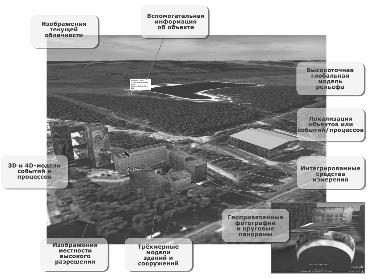 Космоснимки — основа Google Earth. Их разрешение уже составляет один метр и лучше, и качество постоянно растет. Они идеально подходят для восприятия обстановки — ведь именно с таким разрешением видны невооруженным глазом ориентиры на открытой местности. Наложенные на глобальную модель рельефа, космические снимки создают завораживающий своей достоверностью образ местности в любых, самых укромных уголках Земли (рис. 1б). Объекты можно наблюдать под любыми ракурсами (режим голографии), обеспечивая полноту визуального восприятия. Однако помимо голографичности, то есть возможности просмотра с разных ракурсов, в Google Earth реализована также и многомасштабность, позволяющая просматривать сцену еще и с различного удаления. Такой режим визуализации превосходит голографию и может быть назван сверхголографией8. Google Earth и другие подобные системы активно насыщаются трехмерным контентом, причем его может создавать любой пользователь с помощью встроенных инструментов редактирования. Цифровая Земля — это ни в коем случае не «просто глобус». Это единая глобальная геоцентрическая среда интеграции информации, имеющая своей основой модель поверхности Земли, но ею нисколько не ограниченная. Глобус — это лишь каркас для накопления геолокализованных данных.