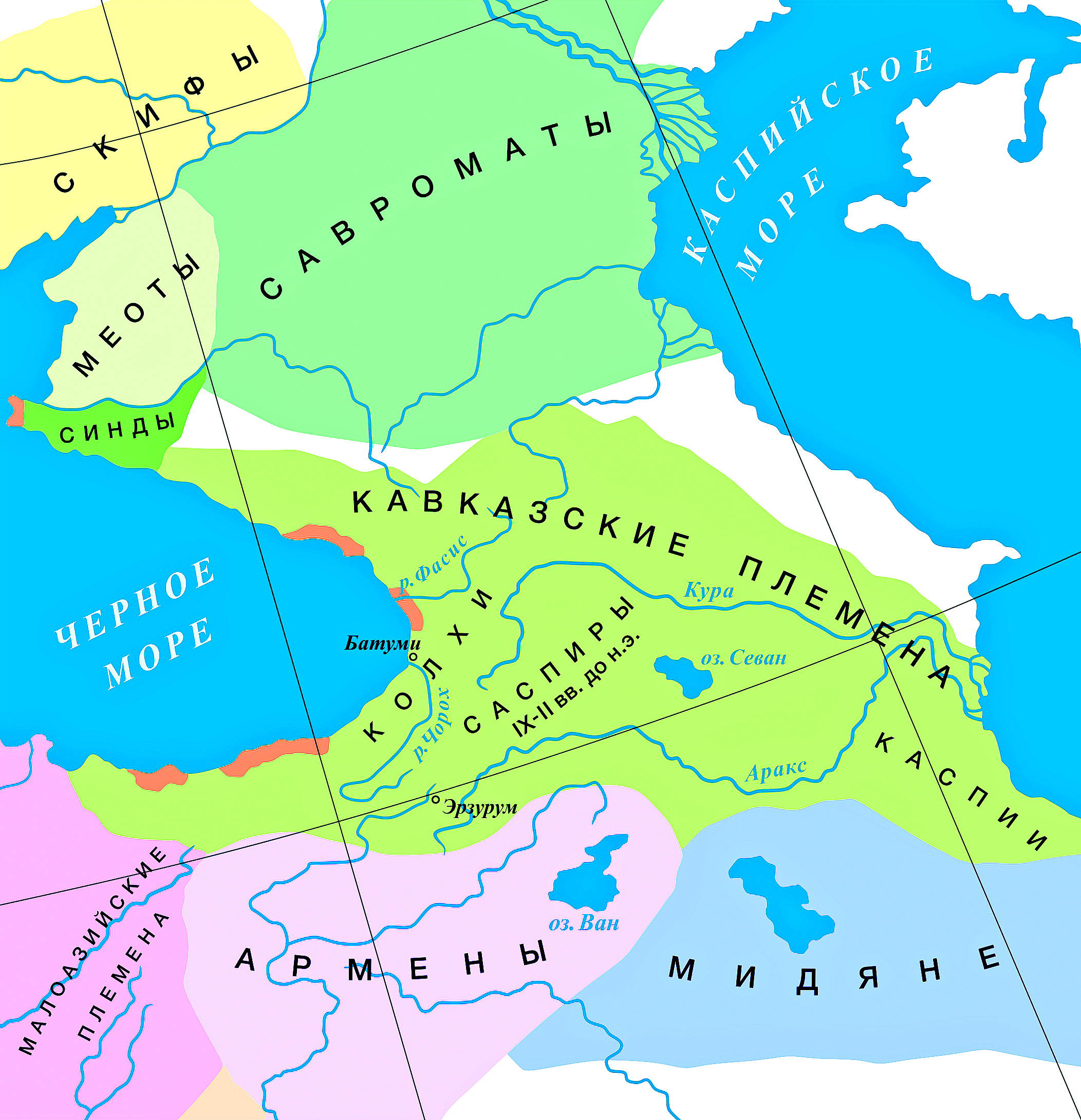 Анализ “Истории” Геродота дает серьезный повод говорить о саспирах как об индоевропейцах. Даже имена предводителей саспиров – Сиромитра и его сын Масистий – иранские, хотя даются в грузинской огласовке. В VII в. до н.э. в сторону Мидии двигаются скифы. Но, чтобы попасть в желаемый регион, им нужно было сломить такие могущественные государства, как Ассирия и Урарту, и это не считая племен, расположенных по восточному побережью Понтийского моря, – прежде всего племенных союзов колхов и саспиров.