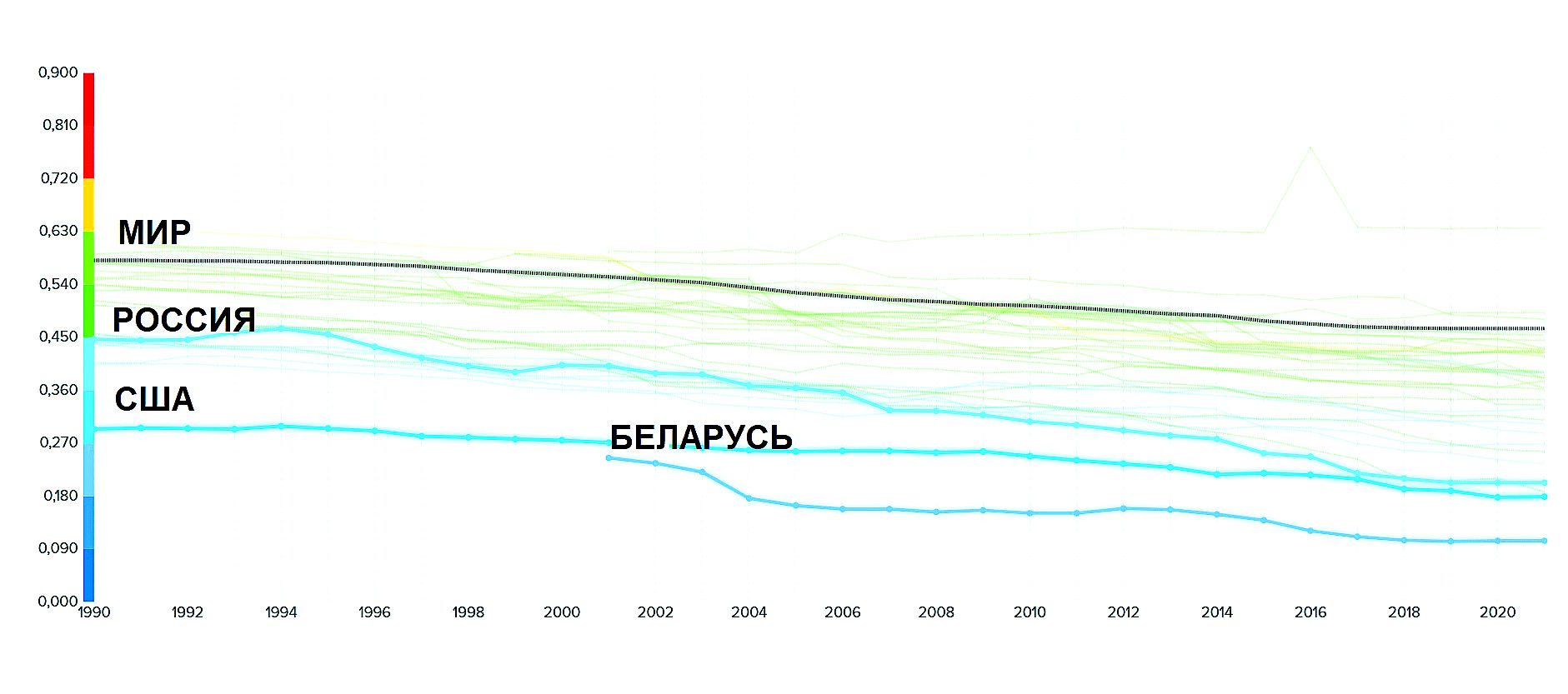 Следует отметить, что, согласно другим оценкам, публикуемым в программе Организации Объединенных Наций за 2021 г., общие индексы гендерного неравенства (GII) для России и Беларуси довольно низкие: для России – 0.203, Беларуси – 0.104 (GII n.d.). Данные по динамике гендерного неравенства на основе индекса однозначно указывают на его неуклонное снижение в России и Беларуси. При этом, если исходно (данные за 2001 г.) этот индекс уже был ниже для Беларуси (по сравнению с США), то для России (исходные данные за 1990 г.) он не просто демонстрировал выраженную динамику к снижению, но и стал к 2020 г. ниже (по сравнению с США) (Рис. 1).