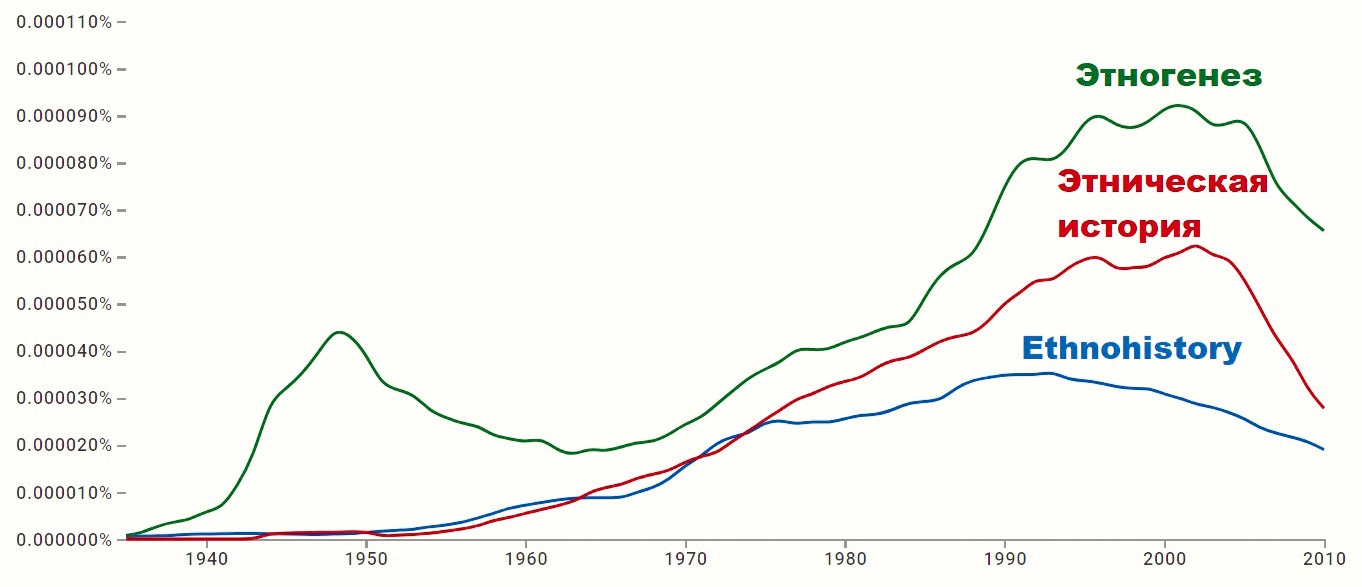 Но почему рост упоминаемости “этнической истории” и “этногенеза” продолжался столько лет, не наступала усталость от темы, почему не появлялись другие парадигмы исследования?