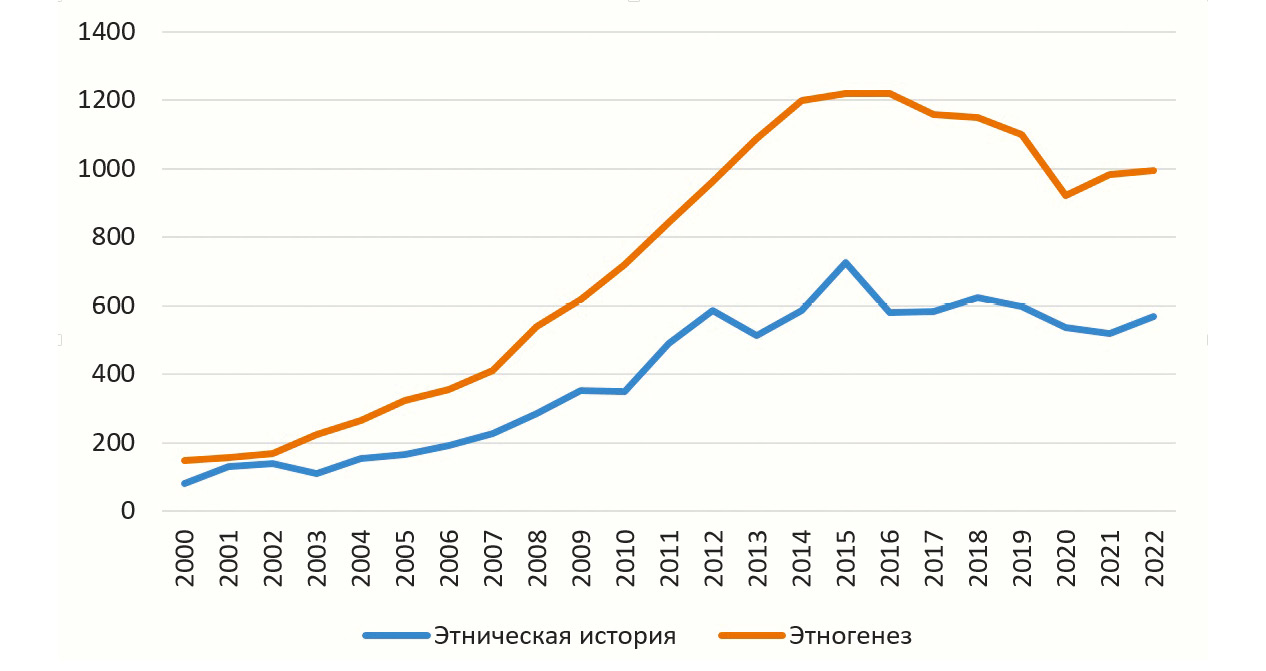 Рис. 2. Упоминания терминов “этническая история” и “этногенез” в научных работах (по данным Google Scholar)