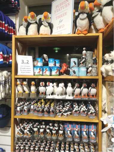 Одно из самых заметных проявлений действия “взгляда туриста” – повсеместные “тýпикмаги”. Lundabúð (от исл. lund – “тýпик” и búð – “магазин”) – “народное” название популярных туристических магазинов, заполоненных дешевыми фигурками тупиков и викингов в различных вариантах, магнитами, брелоками, майками, кружками и другими китчевыми сувенирами (см. Рис. 1). Появившийся в июле 2015 г. неологизм (Orðabókin n. d.) быстро прижился (как и его англоязычная версия – puffin shop) и стал настолько популярен, что был включен в словари современного исландского языка. Не все сувенирные магазины “удостаиваются” этого названия – только те, что рассчитаны на массового непритязательного туриста, торгуют безделушками, произведенными на фабриках Китая, и имеют слабое отношение к исландской культуре.