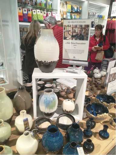 Рис. 2. Керамика ручной работы, сопровожденная фотографией художницы и краткой информацией о ней. Сувенирный магазин в аэропорту. Фото автора. Рейкьявик, 2018 г.