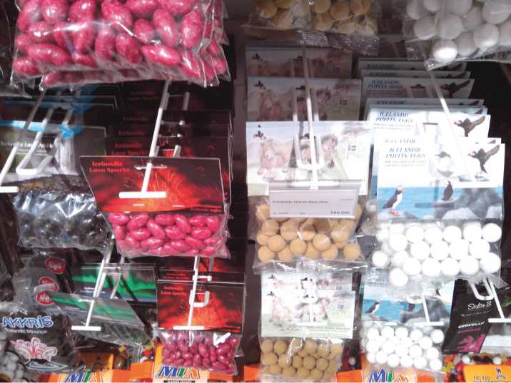 Типичный “неправильный” сувенир зачастую представляет собой что-то не очень практичное и безвкусное, нередко произведенное в другой стране: магнит на холодильник в форме Исландии, фигурка тупика в викингском шлеме, в лучшем случае – кружка с фотографией Рейкьявика или майка с надписью “Я не говорю по-исландски”. Тупики, не воспринимающиеся большинством исландцев как часть природы страны, возглавляют рейтинг антисувениров. Давление “взгляда туриста”, однако, так велико, что, насколько можно судить, для “местного взгляда” эти птицы постепенно начинают становиться “своими”. Осуждение вызывают и популярные сладости, которые продаются в туристических магазинах в китчевых упаковках под названиями вроде “Лошадиные каки” или “Брызги лавы” (см. Рис. 3). По мнению исландцев такие конфеты можно (и нужно) купить в обычном супермаркете под “нормальным” названием, в нейтральном пакетике, никак не связанном с природными феноменами, и в несколько раз дешевле. В этом случае возмущение вызывает то, что, с одной стороны, местные предприниматели беззастенчиво наживаются на туристах, с другой – то, что путешественники не хотят получить “аутентичный” опыт покупки в нетуристическом магазине, предпочитая экзотизированную версию, напоминающую о броских сувенирах из бывших колоний. По сути, “взгляд туриста” конструируется производителями подобных товаров и экстраполируется на существующие местные конфеты, отчуждая их. Хотя содержимое пакетика лакричных сластей остается прежним, его оформление и цена “отравляют” опыт его поедания как приобщения к культуре исландцев.