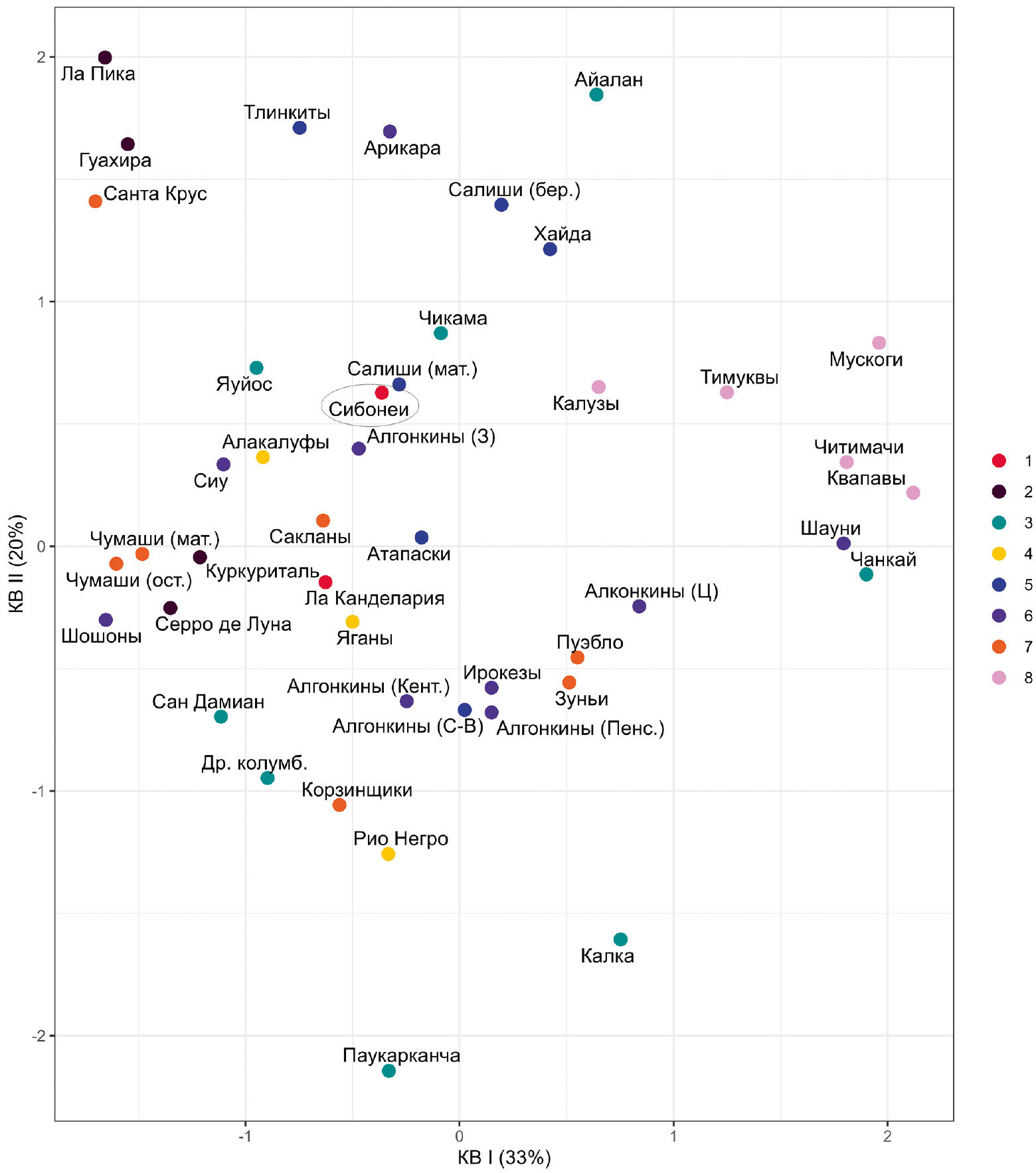 Рис. 2. Расположение мужских серий недеформированных черепов в пространстве первых двух канонических векторов. 1 – Центральная Америка; 2 – север и северо-восток Южной Америки; 3 – Анды; 4 – Огненная Земля и Патагония; 5 – субарктика и северо-западное побережье Северной Америки; 6 – центральная Северная Америка; 7 – юго-запад Северной Америки; 8 – юго-восток Северной Америки