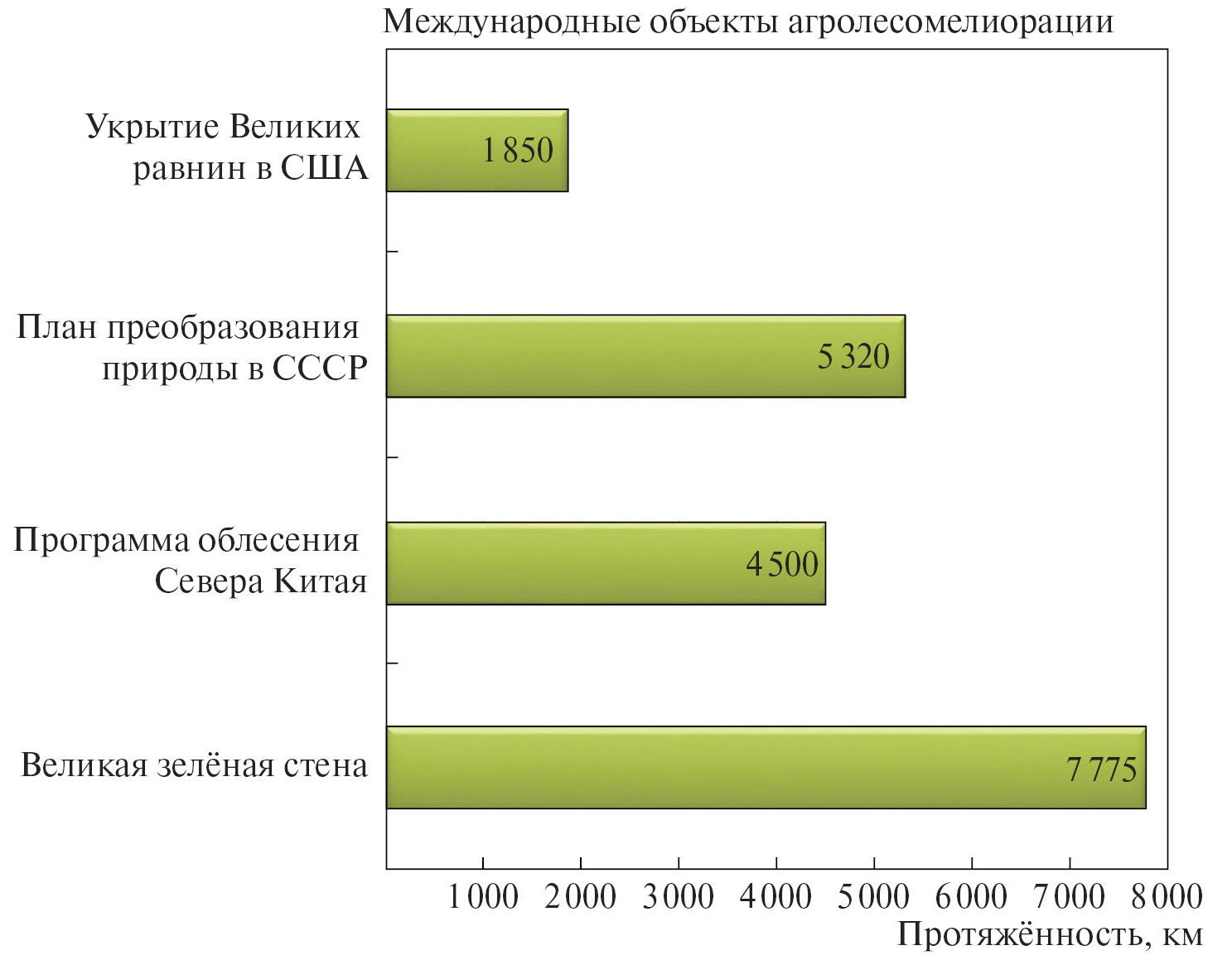 Рис. 1. Сравнение протяжённости лесомелиоративных насаждений в международных агролесомелиоративных проектах
