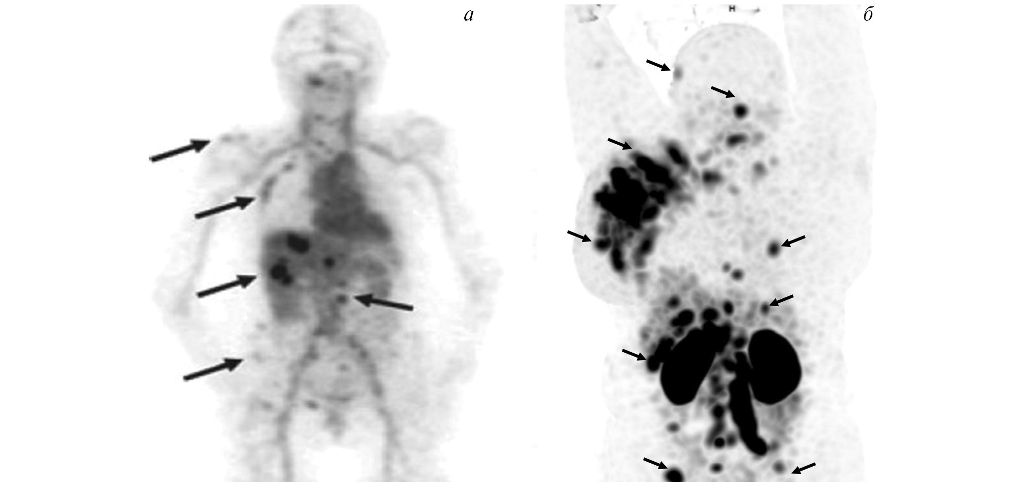 Рис. 1. ПЭТ-изображение пациентки с HER2/neu-позитивным раком молочной железы, выполненное через 5 суток после введения 89Zr-транстузумаба (a), стрелками обозначены метастазы в печень и кости [12]; ОФЭКТ-изображение пациентки с HER2/neu-позитивным раком молочной железы через 2 ч после введения 99mTc-ADAPT6 (б), стрелками обозначены первичная опухоль, метастазы в лимфатические узлы, печень и кости