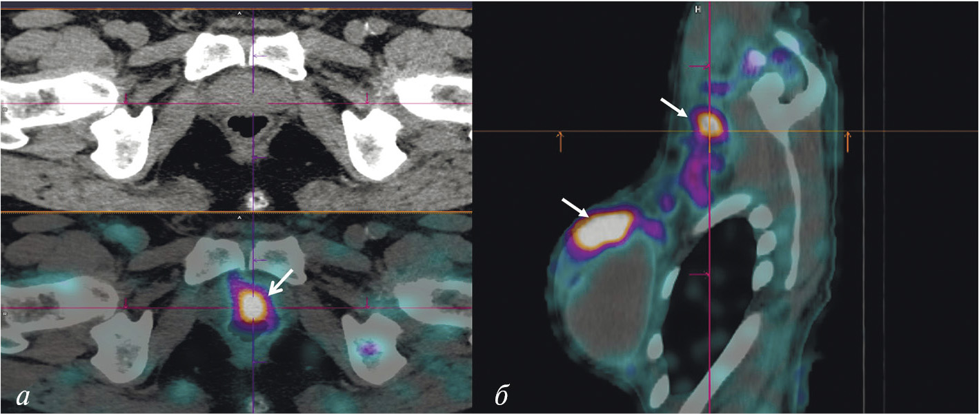 Рис. 5. ОФЭКТ/КТ с 99mТс-RM26 пациентов с раком простаты (а) и раком молочной железы (б) Стрелками обозначено накопление РФЛП в опухоли и лимфогенном метастазе