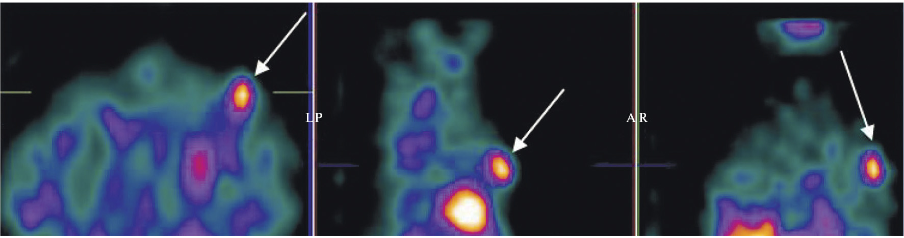 Рис. 7. ОФЭКТ/КТ с 99mTc-1-Тио-D-глюкозой пациента с рецидивом глиобластомы. Стрелками обозначено накопление РФЛП в опухоли