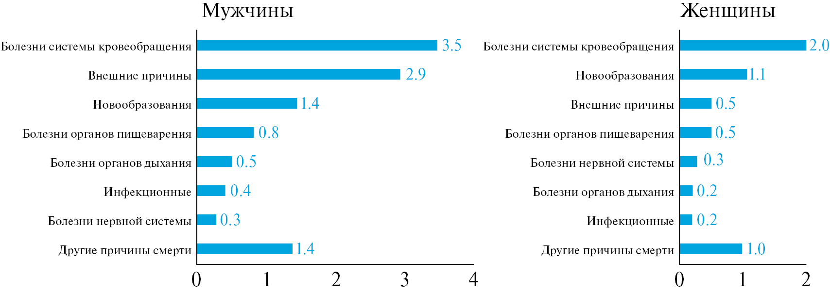 Рис. 1. Декомпозиция разрыва в ожидаемой продолжительности жизни между Россией и Германией (лет)