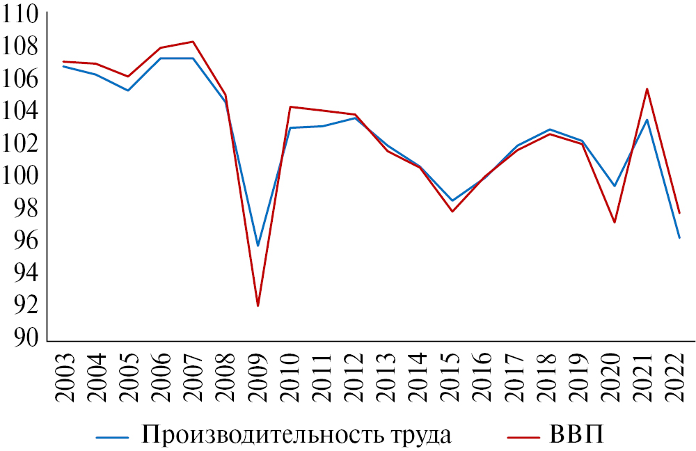 Рис. 2. Индексы роста ВВП и производительности труда в 2003–2022 гг.