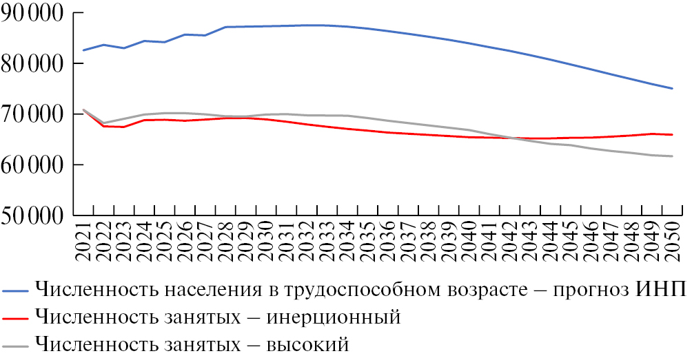 Были рассмотрены два варианта развития экономики на долгосрочную перспективу. Главным отличием явилось то, что за счёт стимулирования инвестиционной активности по высокому варианту среднегодовые темпы роста вложений в основной капитал оказываются примерно на 1 п.п. выше, чем по инерционному сценарию (4.5 против 3.5%). При этом среднегодовые темпы роста ВВП по вариантам отличаются примерно на ту же величину (3.1 против 2%). Однако различия в динамике спроса на труд между вариантами качественные, особенно к концу прогнозного периода. В высоком варианте сохраняется разрыв между численностью населения в трудоспособном возрасте и фактической численностью занятых. В инерционном варианте этот разрыв сокращается, что ужесточает ограничения роста, обусловленные дефицитом трудовых ресурсов. Такой результат достигается в силу того, что даже при относительно небольшом увеличении инвестиций в целом по экономике создаются условия для повышения производительности руда и сокращения занятости в трудоизбыточных секторах российской экономики: сельском хозяйстве, торговле, низкотехнологичных обрабатывающих отраслях. В свою очередь больший вклад в экономическую динамику будут вносить менее трудоёмкие сектора: высокотехнологичные отрасли обработки, телекоммуникации и связь.
