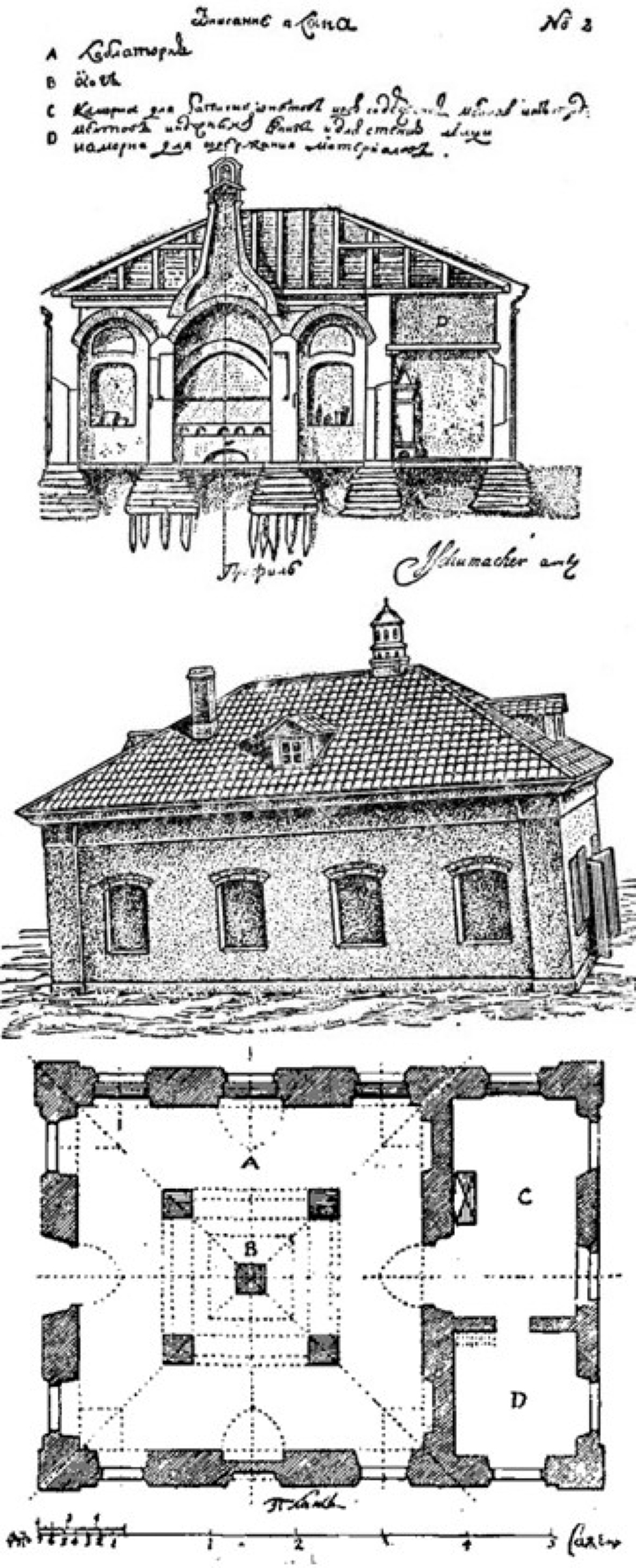 Рис. 3. Разрез, внешний вид и план первой в России научной химической лаборатории (чертёж архитектора И.Я. Шумахера)