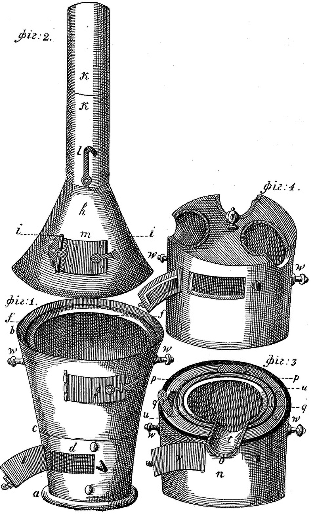 Ломоносову потребовалось время для оснащения лаборатории, и реальные исследования в ней начались не ранее весны 1749 г. Часть приборов была выполнена по его собственным рисункам и чертежам (рис. 4). При этом он нередко оплачивал приобретение нужного инвентаря из своих личных средств. Здесь имелись необходимая мебель, инструменты, химическая посуда, большой набор весов. Особенно впечатляло разнообразие печного оборудования – девять различных печей для плавки и обжига (рис. 5) [13, c. 233].