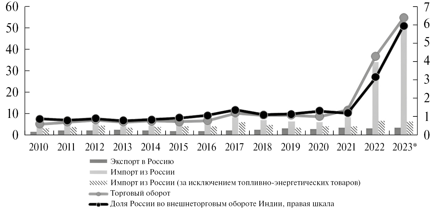 Рис. 9. Торговый оборот между Индией и Россией, млрд долл. *Данные за январь–октябрь 2023 г.