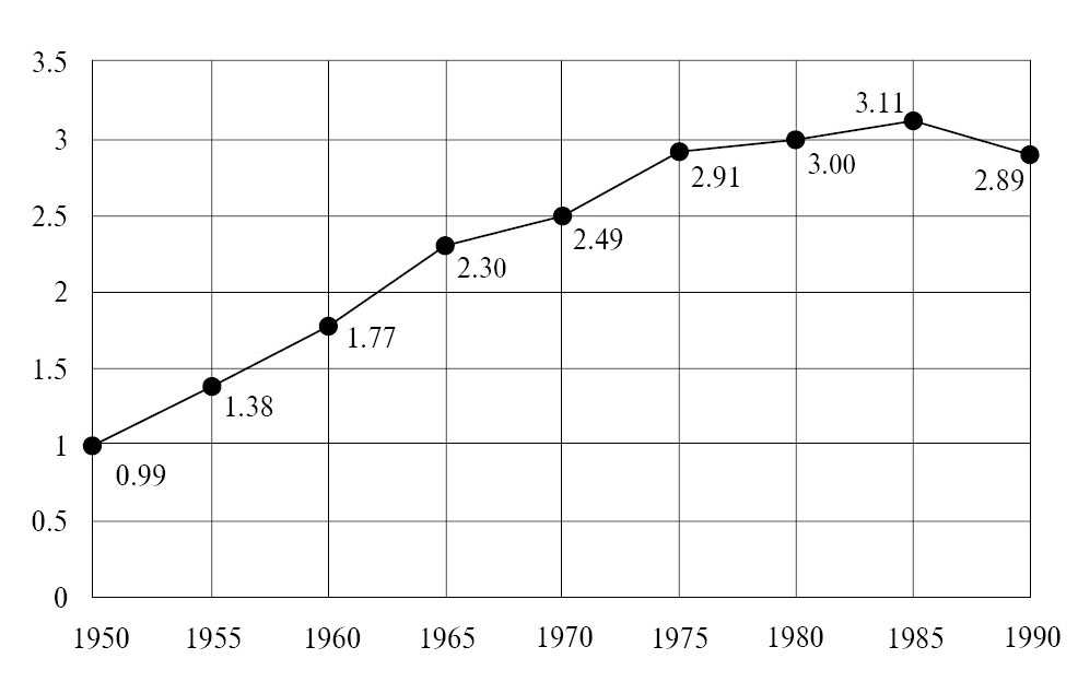 Рис. 1. Доля расходов на НИОКР в ВВП СССР, в % Источник: Варшавский А.Г., Сироткин О.С. Научно-технический потенциал // Путь в XXI век. Стратегические проблемы и перспективы российской экономики. М.: Экономика, 1990. С. 350.