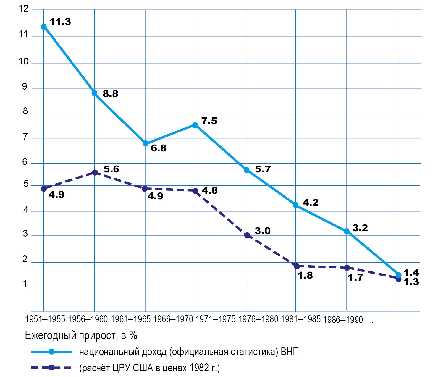 После смещения Н.С. Хрущёва со всех постов и отказа от крайностей в экономической политике обстановку удалось стабилизировать. В результате 1950–1960-е годы оказались весьма удачными для советской экономики, о чём свидетельствуют данные как официальной статистики, так и альтернативные расчёты. И только с начала 1970-х годов обозначилось прогрессирующее падение темпов роста (рис. 2).