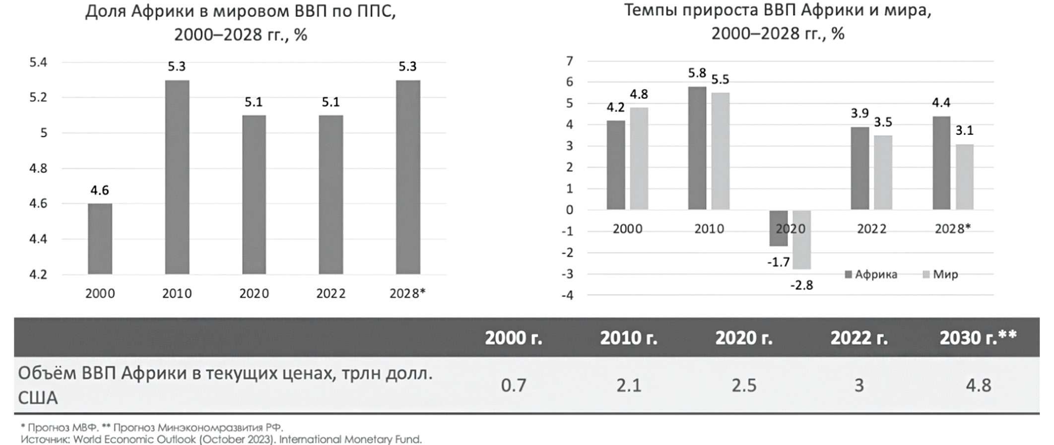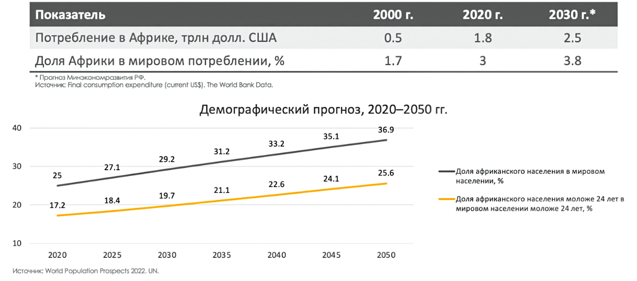 Помимо роста экономического и демографического потенциала Африки важными преимуществами развития отношений России с Африканским континентом служат отказ большинства государств от присоединения к антироссийским санкциям, рост покупательной способности населения, наличие минеральных ресурсов, необходимых российским производителям, объёмный рынок сбыта сельскохозяйственной и энергетической продукции, спрос на современные технологии, ускоренное развитие цифровой сферы, развитие интеграционных процессов в Африке как на региональном, так и на континентальном уровнях.