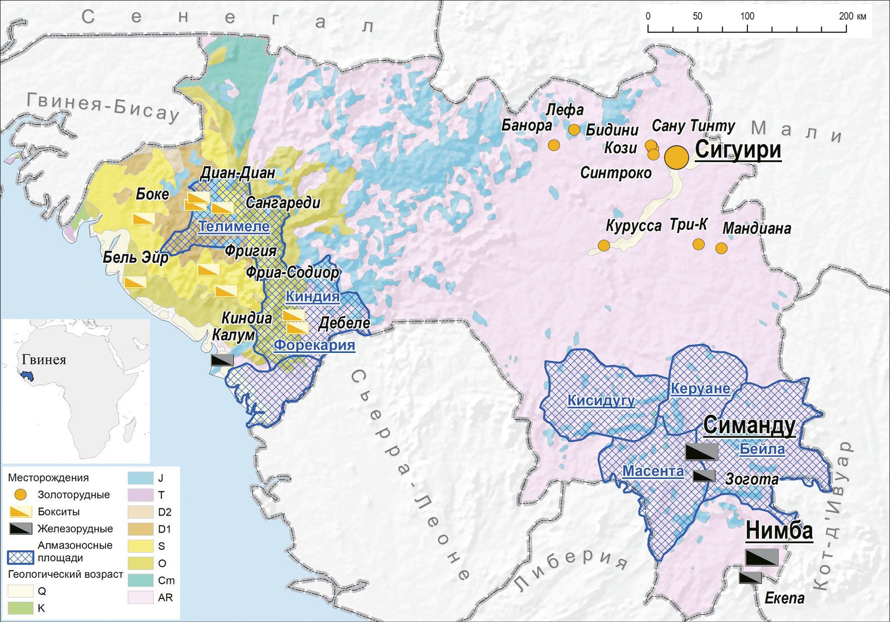 Геология и металлогения Гвинеи. Страна расположена в южной части раннедокембрийского Западно-Африканского кратона, преимущественно в области Леоно-Либерийского щита. В центре и на юго-востоке на поверхность выходят архейские гнейсы, кристаллические сланцы и гранитоиды, а также метаморфизованные вулканогенные и обломочные породы зеленокаменных поясов (см. рис. 1). На северо-востоке расположен Бирримский раннепротерозойский орогенный складчатый пояс, который образован метаморфизованными вулканогенно-терригенными толщами, прорванными гранитами возрастом около 2.1 млрд лет [4]. На западе, параллельно атлантическому побережью, протянулись позднепротерозойские складчатые системы Рокелид и Бассарид, сложенные карбонатно-терригенными отложениями и вулканитами, которые на северо-западе перекрыты полого залегающими терригенными породами ордовика, силура и девона Гвинейской синеклизы.